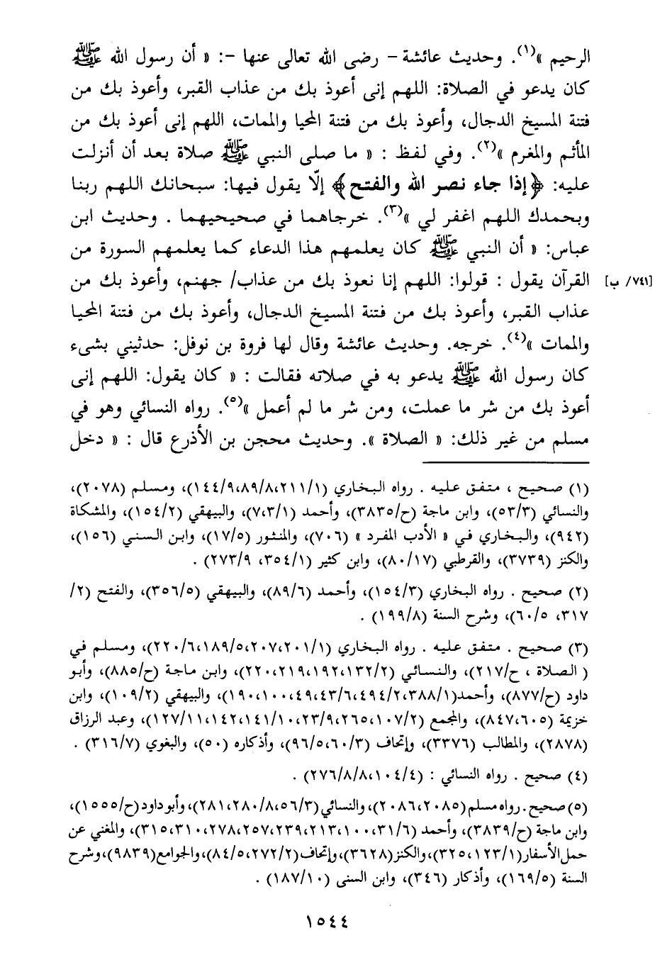 الرحيم " (1) . وحديث عائشة- رضى الله تعالى عنها-: " أن رسول الله صَلَّى اللَّهُ عَلَيْهِ وَسَلَّمَ