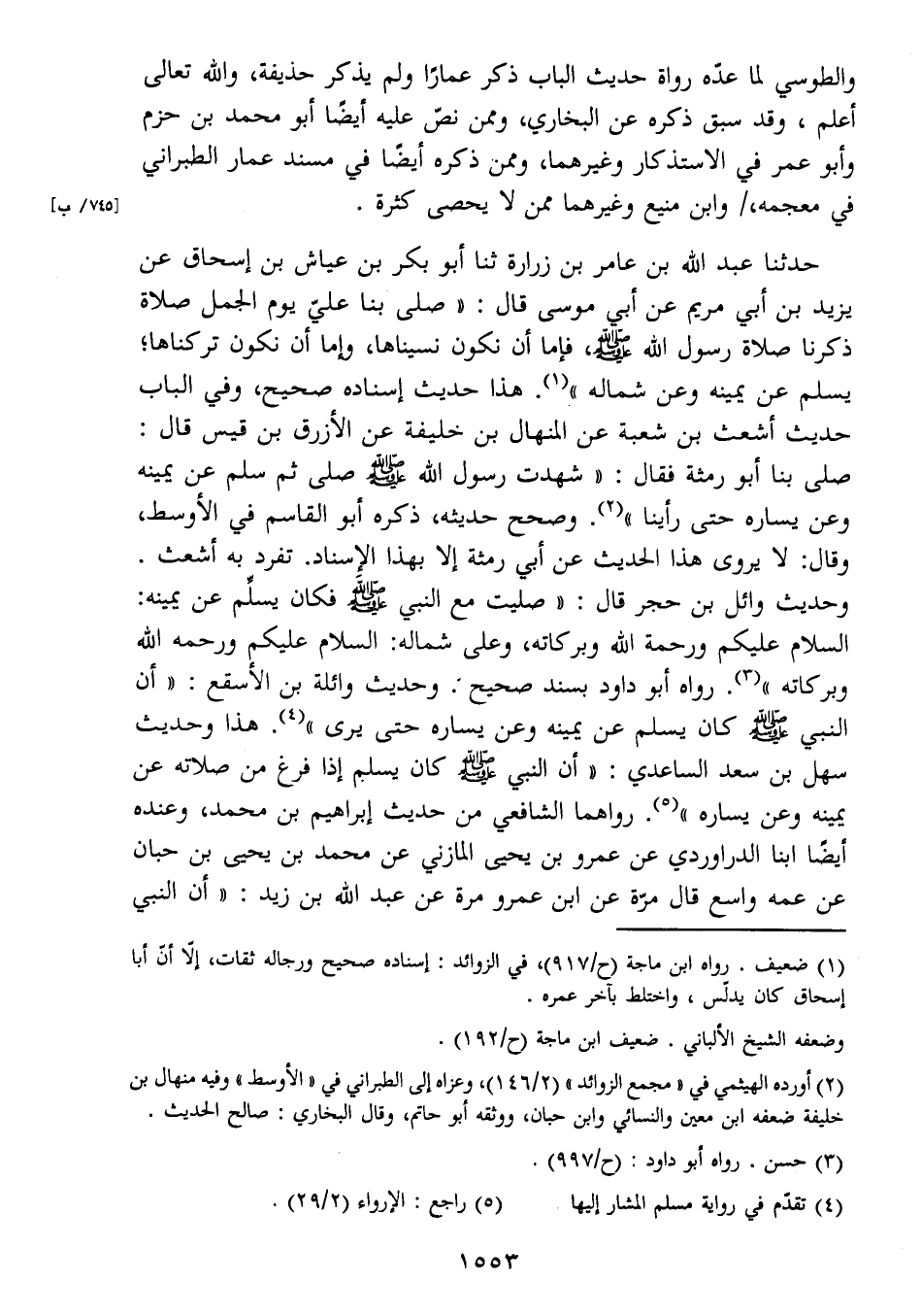 النبي صَلَّى اللَّهُ عَلَيْهِ وَسَلَّمَ كان يسلم عن يمينه وعن يساره حتى يرى " (4) . هذا وحديث