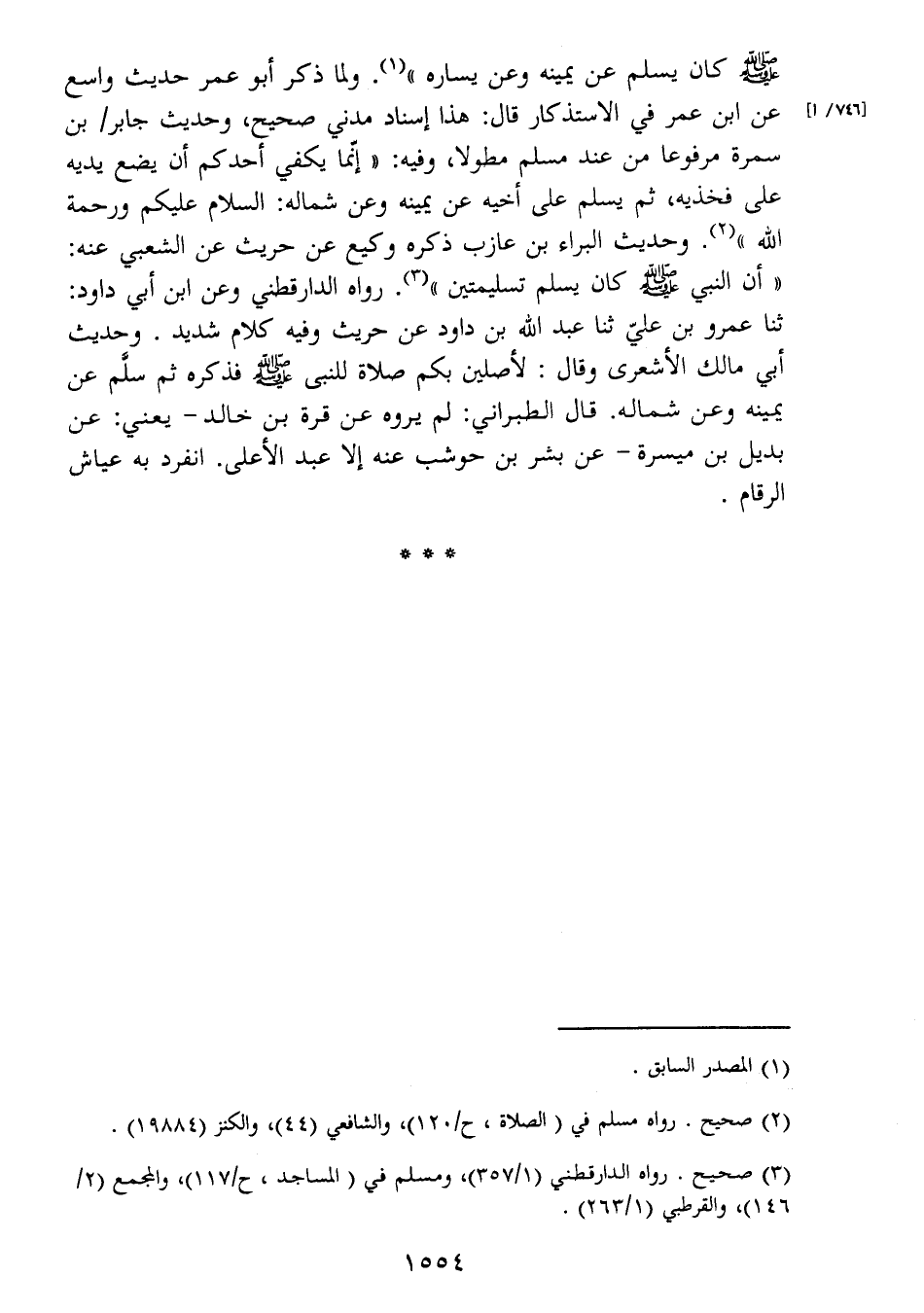 " أن النبي صَلَّى اللَّهُ عَلَيْهِ وَسَلَّمَ كان يسلم تسليمتين " (3) . رواه الدارقطني وعن ابن أبي داود:
