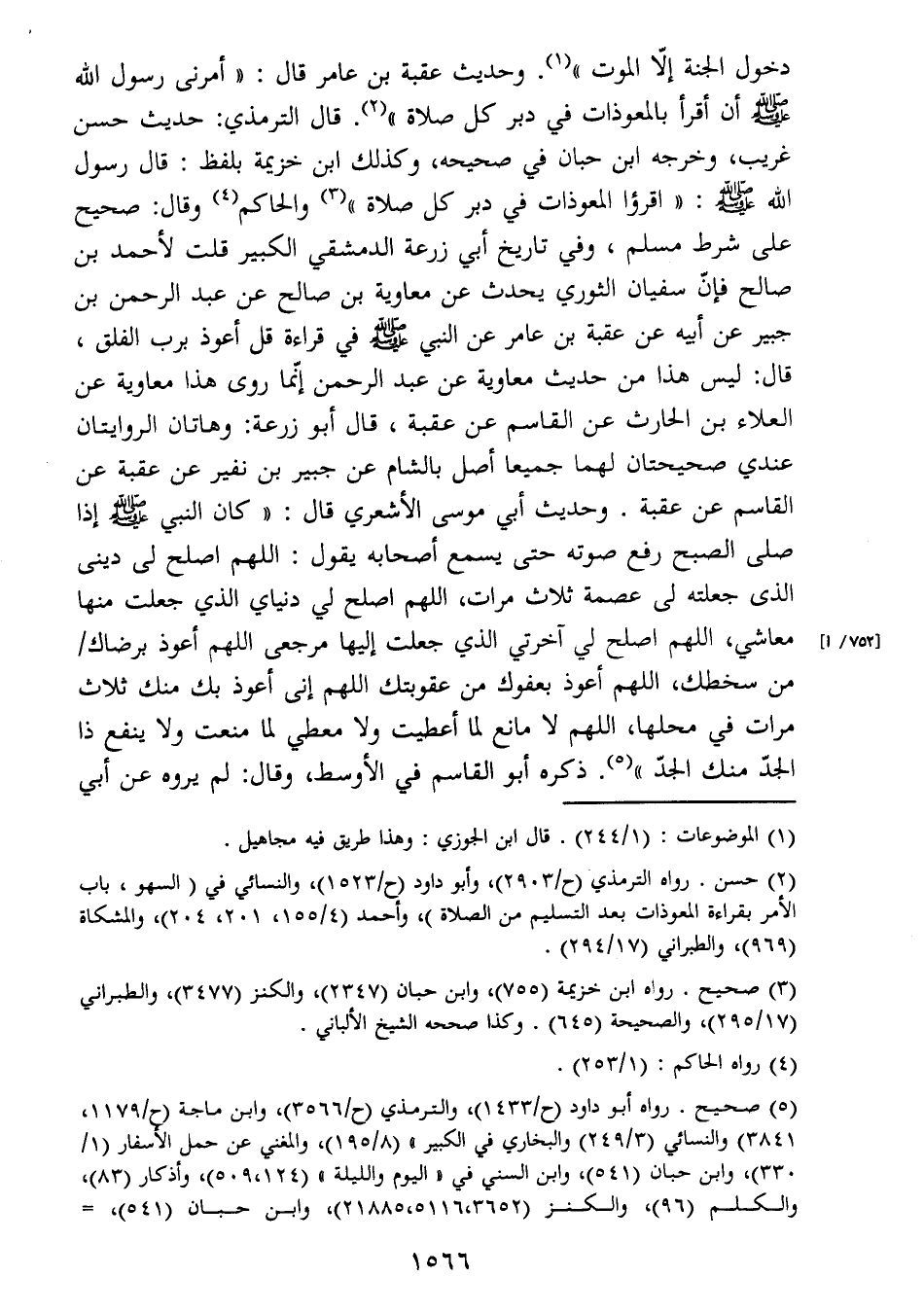 الله صَلَّى اللَّهُ عَلَيْهِ وَسَلَّمَ: " اقرؤا المعوذات في دبر كل صلاة " (3) والحاكم (4) وقال: صحيح