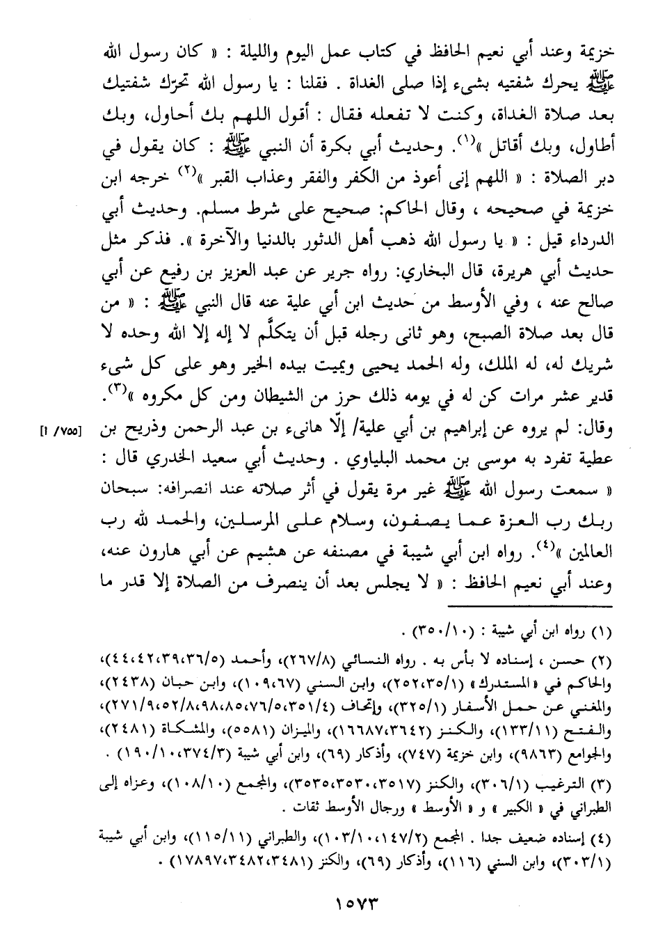 خزيمة وعند أبي نعيم الحافظ في كتاب عمل اليوم والليلة: " كان رسول الله