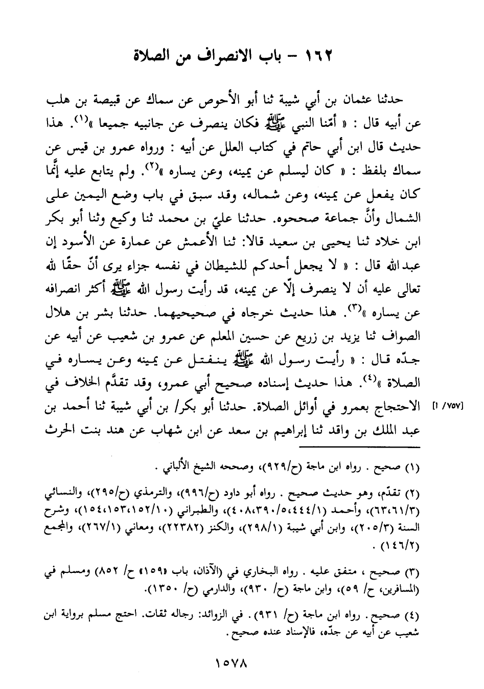 عن أبيه قال: " أمّنا النبي صَلَّى اللَّهُ عَلَيْهِ وَسَلَّمَ فكان ينصرف عن جانبيه جميعا " (1) . هذا