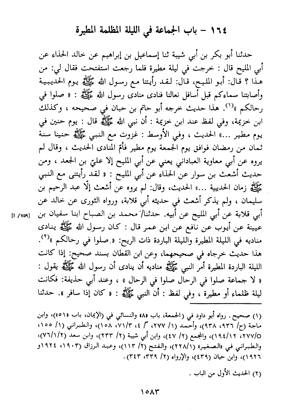 مناديه في الليلة المطيرة والليلة الباردة ذات الريح: ". صلوا في رحالكم " (2) .