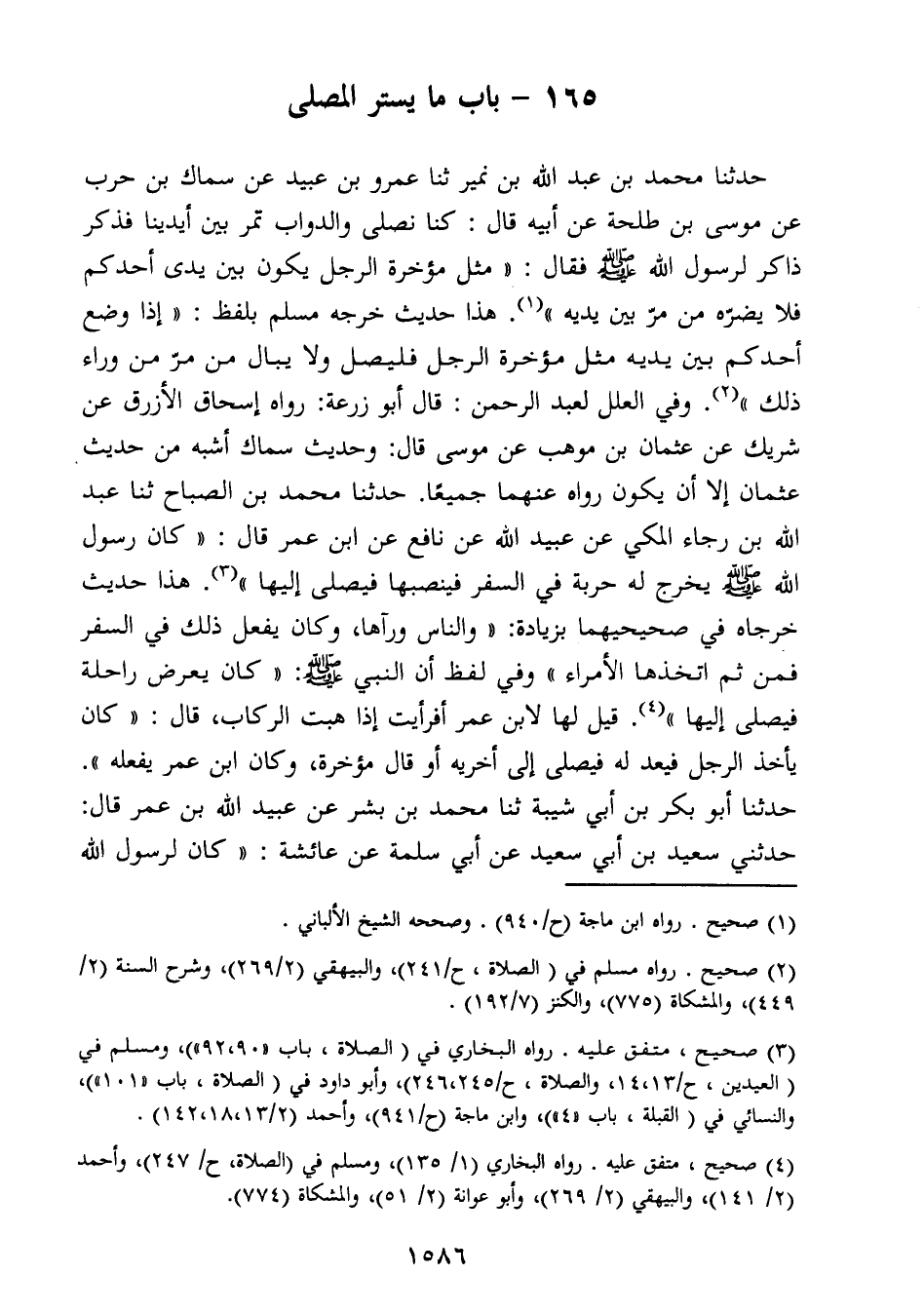 عن موسى بن طلحة عن أبيه قال: كنا نصلى والدواب تمر بين أيدينا فذكر