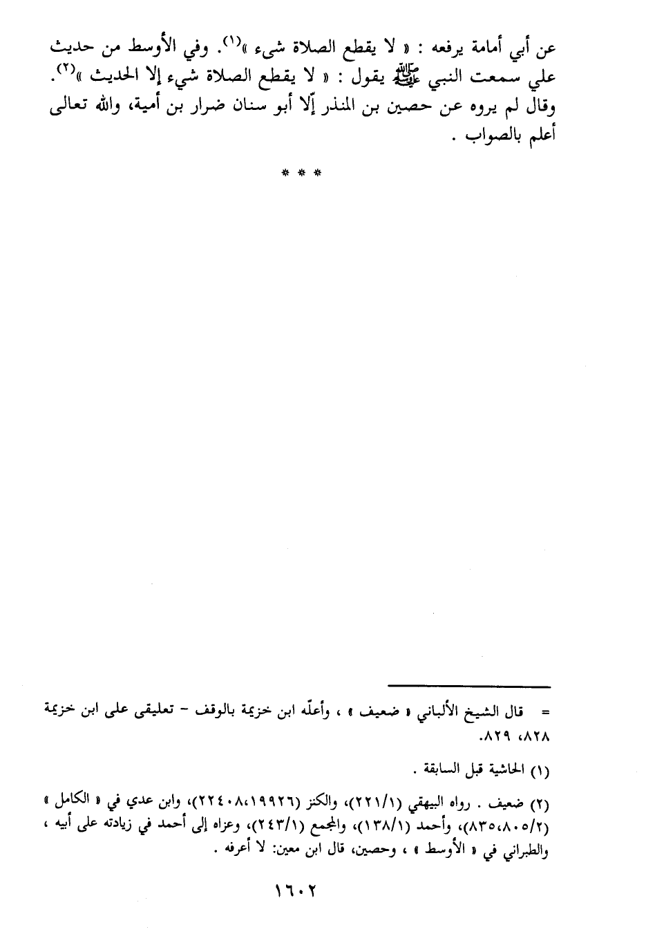 علي سمعت النبي صَلَّى اللَّهُ عَلَيْهِ وَسَلَّمَ يقول: " لا يقطع الصلاة شيء إلا الحديث " (2) .