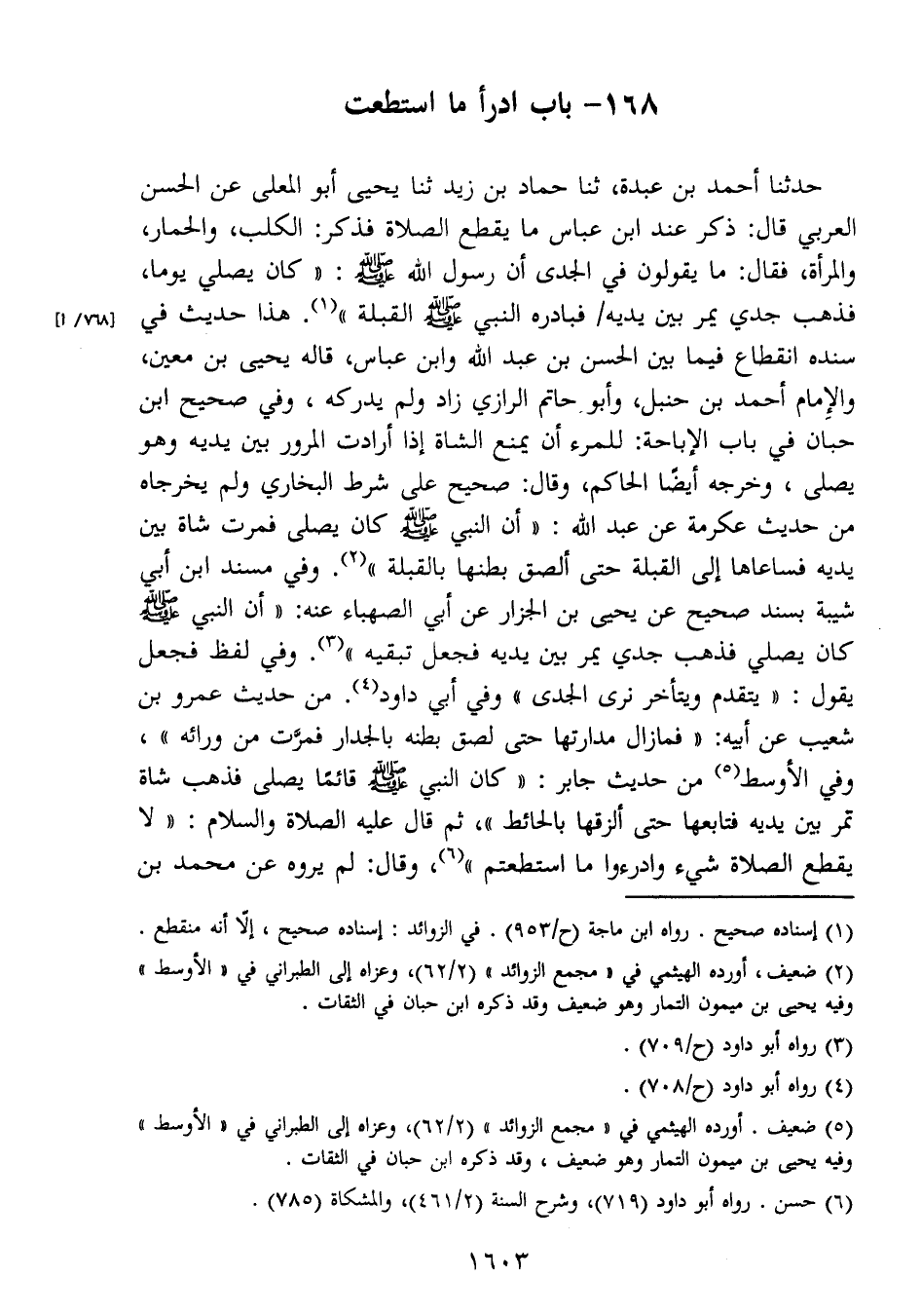 فذهب جدي يمر بين يديه/فبادره النبي صَلَّى اللَّهُ عَلَيْهِ وَسَلَّمَ القبلة " (1) . هذا حديث في