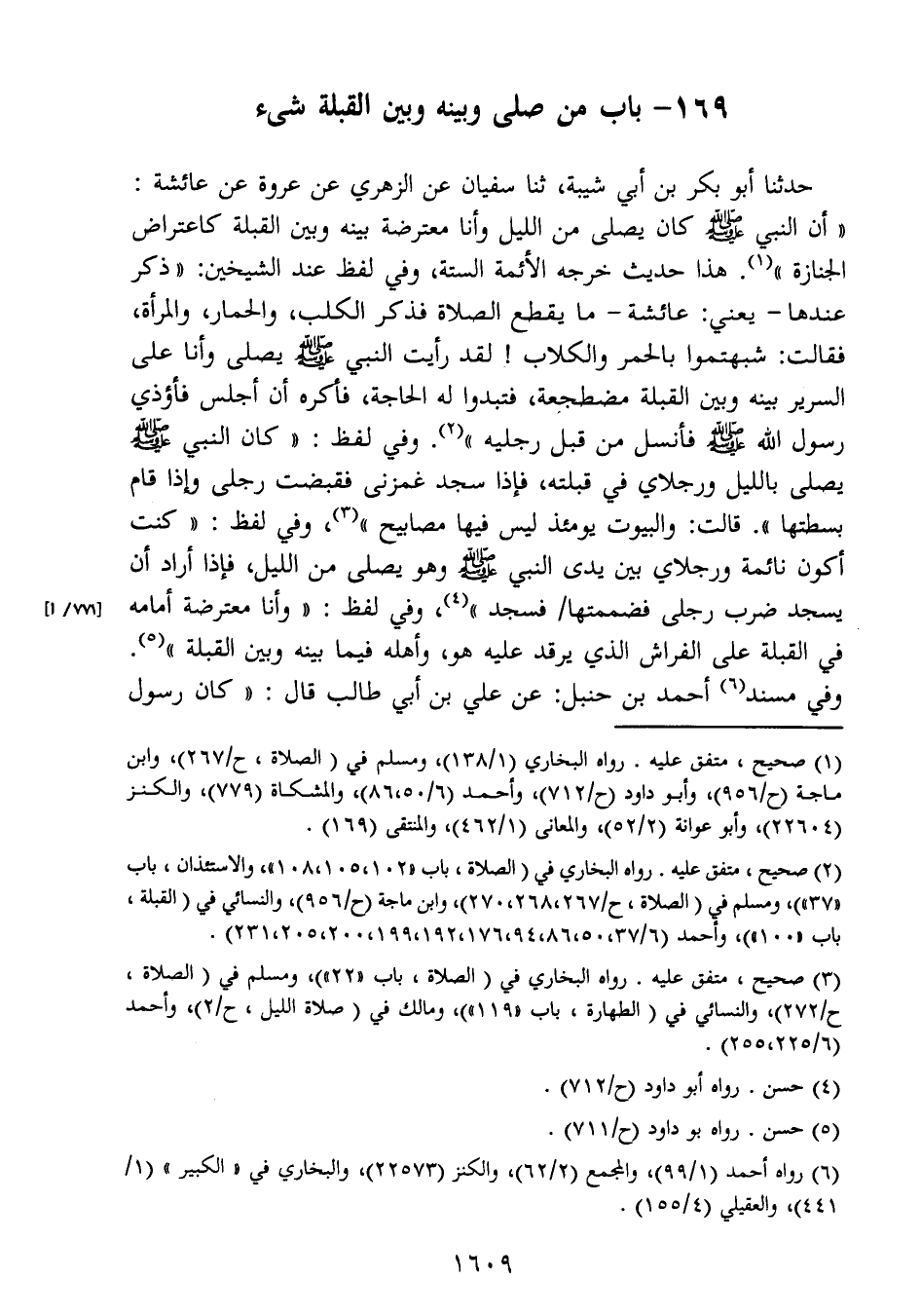 " أن النبي صَلَّى اللَّهُ عَلَيْهِ وَسَلَّمَ كان يصلى من الليل وأنا معترضة بينه وبن القبلة كاعتراض