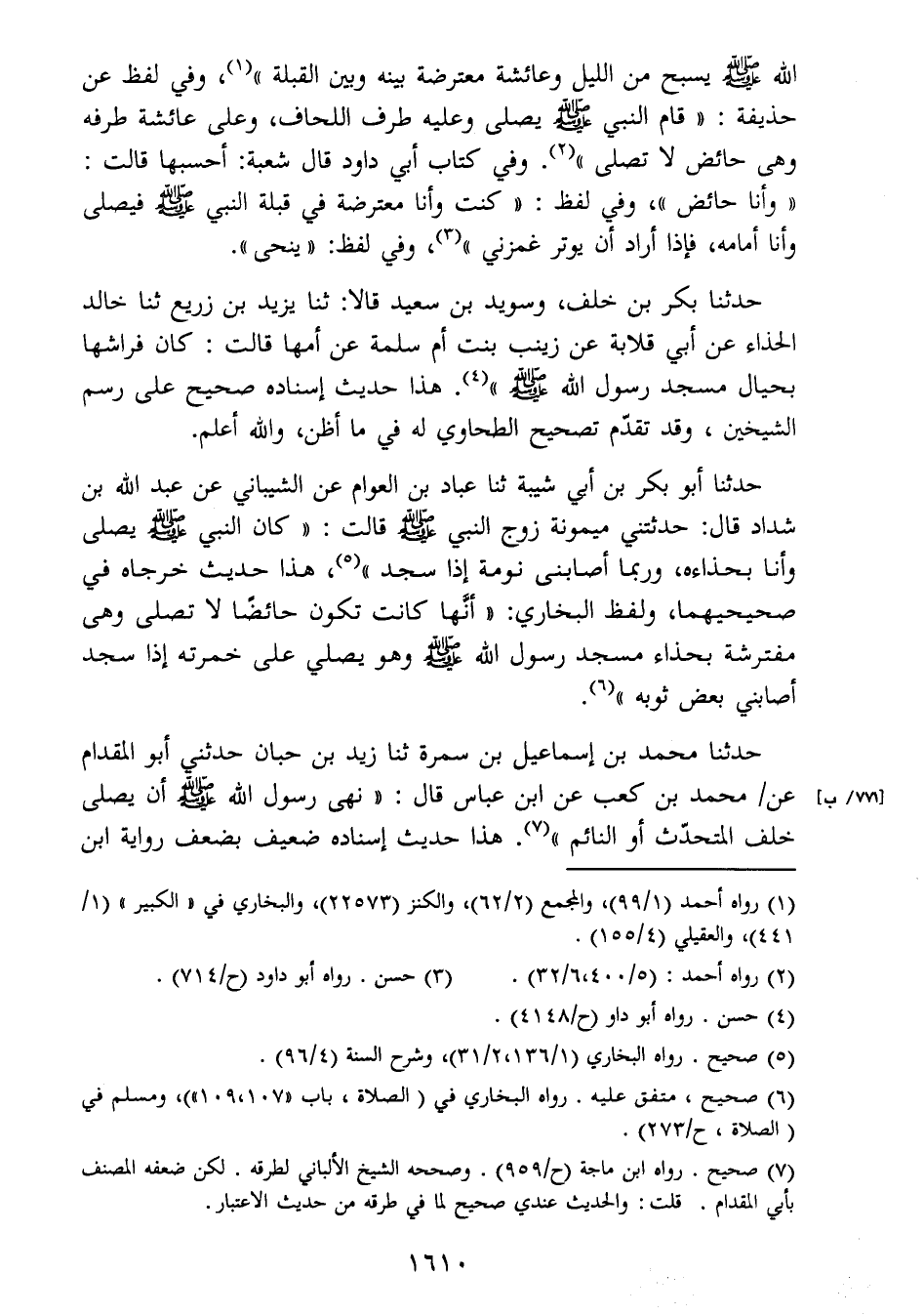 الله صَلَّى اللَّهُ عَلَيْهِ وَسَلَّمَ يسبح من الليل وعائشة معترضة بينه وبين القبلة " (1) ، وفي لفظ عن