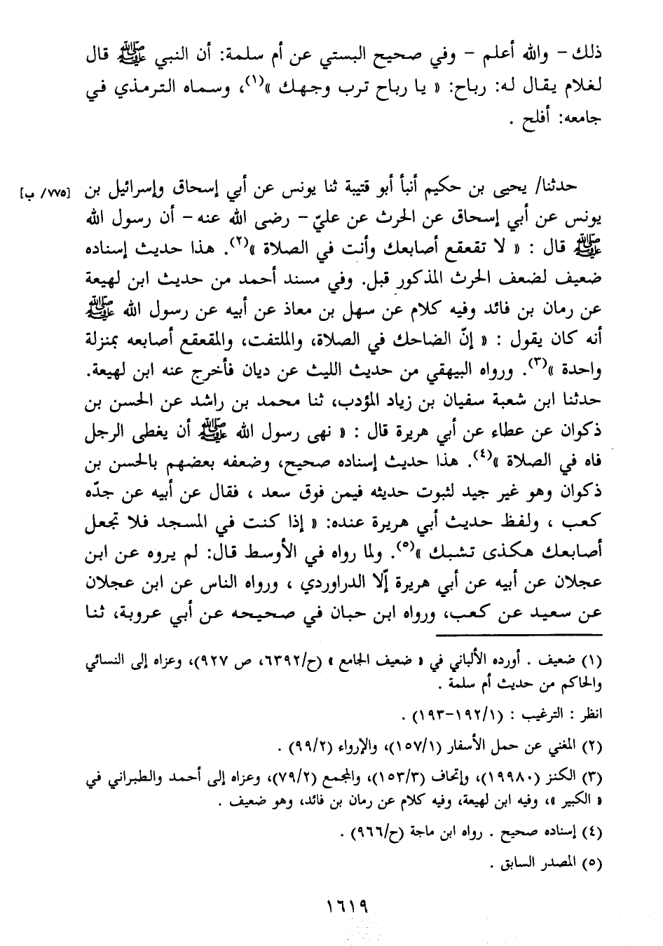 صَلَّى اللَّهُ عَلَيْهِ وَسَلَّمَ قال: " لا تقعقع أصابعك وأنت في الصلاة " (2) . هذا حديث إسناده