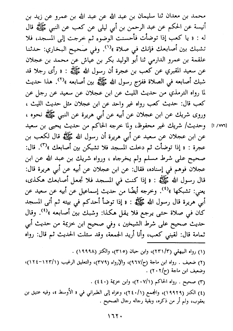 عجرة: " إذا توضأت ثم دخلت المسجد فلا تشبكن بين أصابعك " (3) . قال: