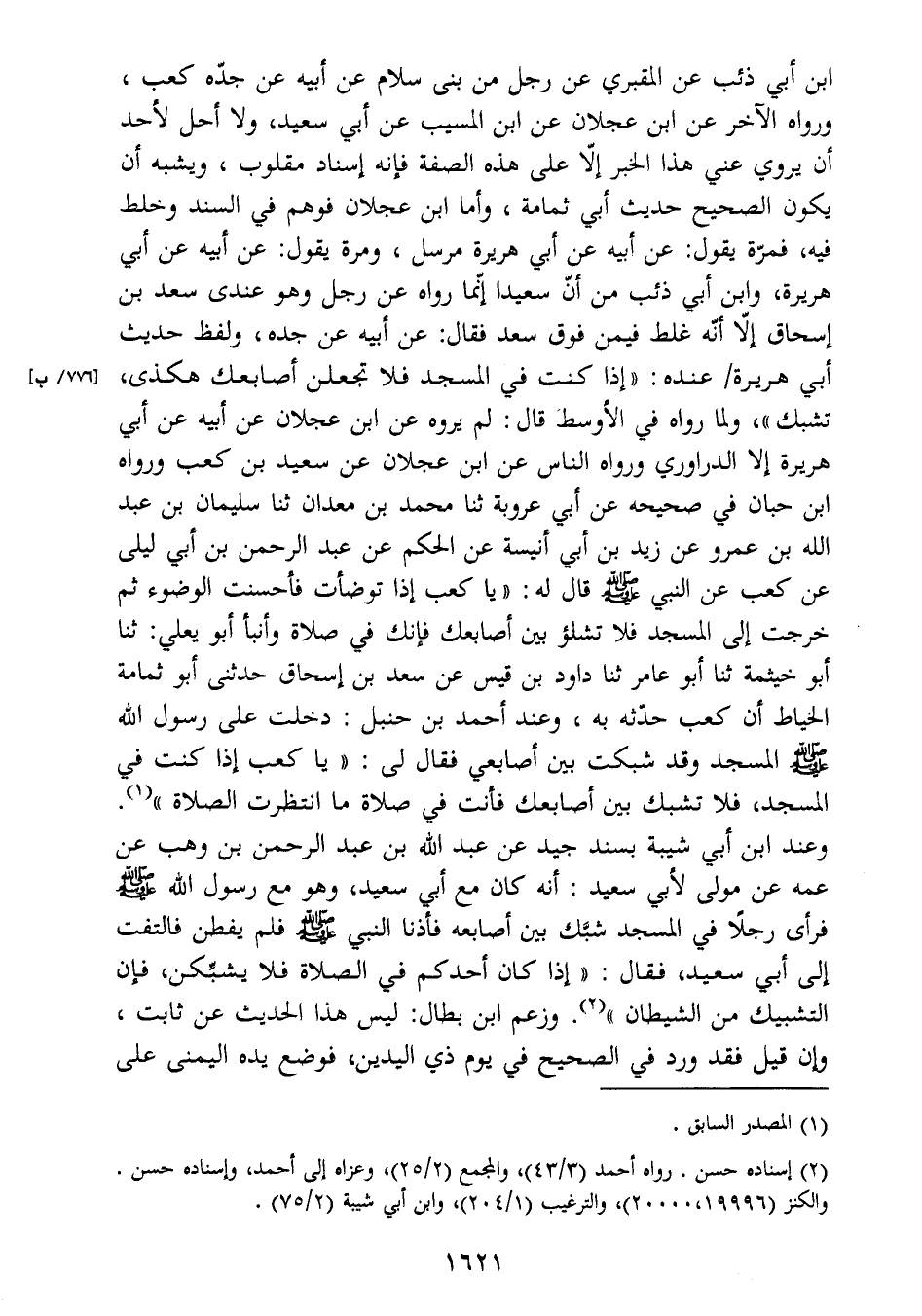صَلَّى اللَّهُ عَلَيْهِ وَسَلَّمَ المسجد وقد شبكت بين أصابعي فقال لي: " يا كعب إذا كنت في