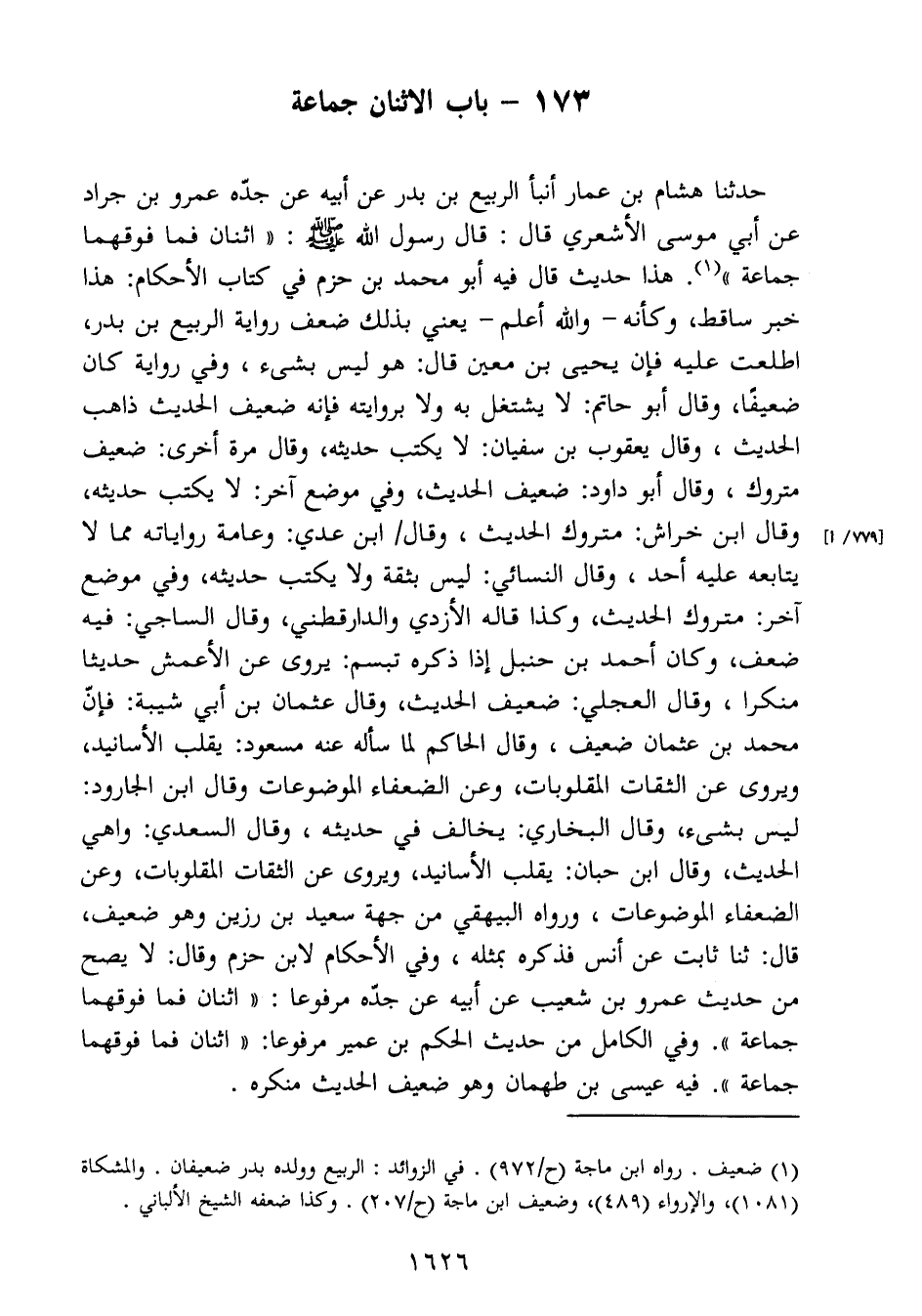 جماعة " (1) . هذا حديث قال فيه أبو محمد بن حزم في كتاب الأحكام: هذا