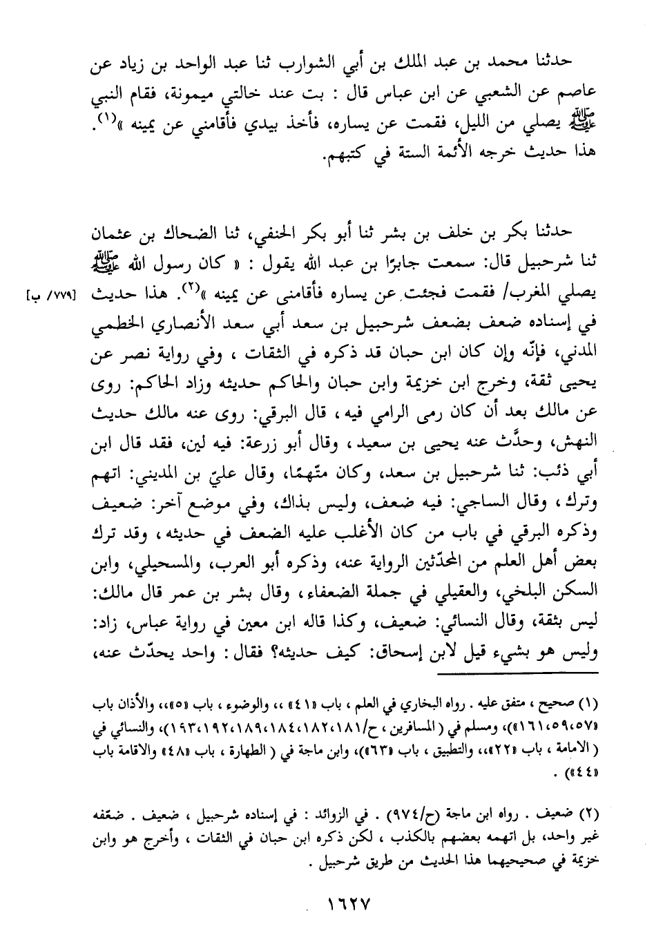 يصلي المغرب / فقمت فجئتِ عن يساره فأقامني عن يمينه " (2) . هذا حديث
