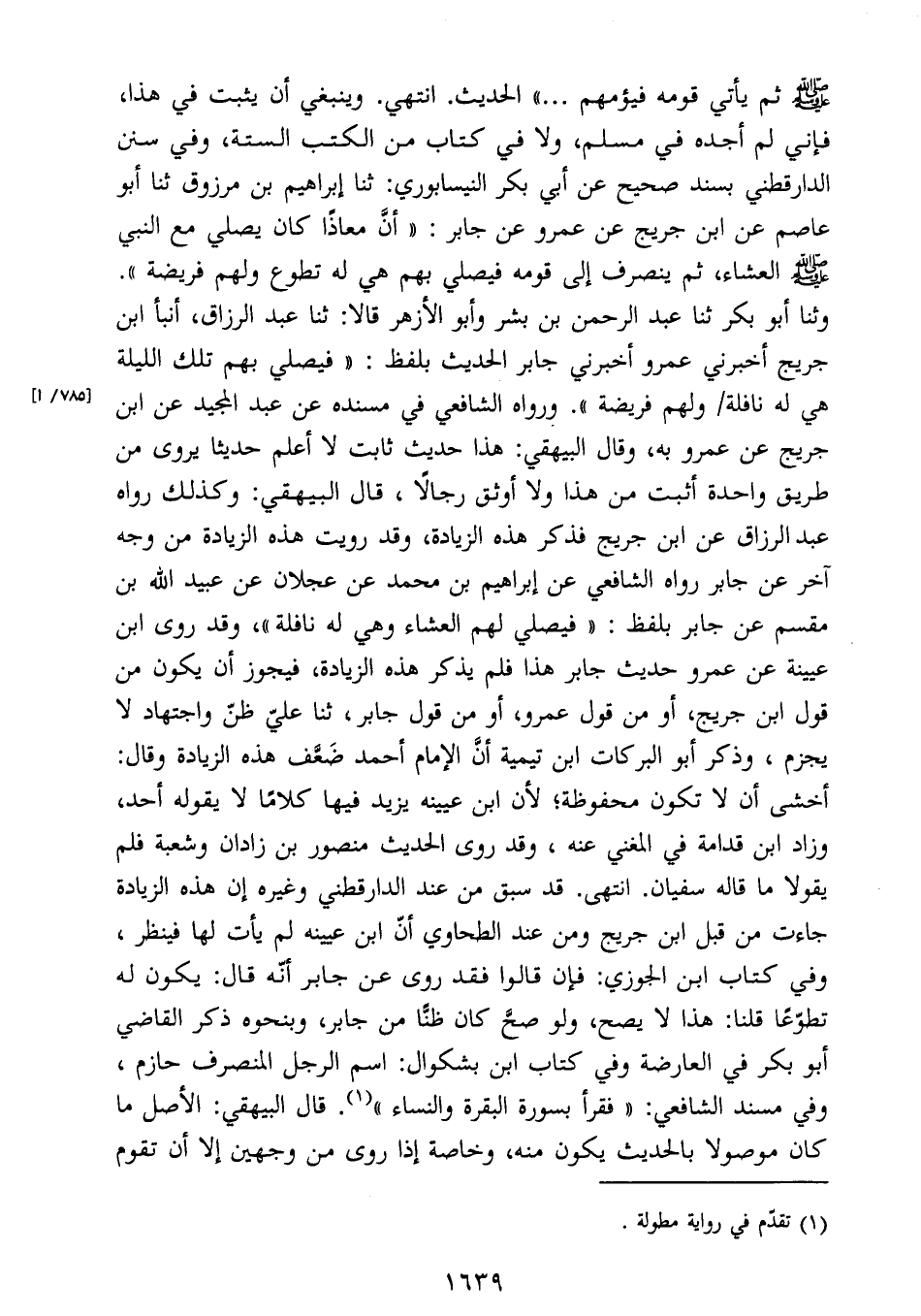 عاصم عن ابن جريح عن عمرو عن جابر: " أنَ معاذا كان يصلي مع النبي