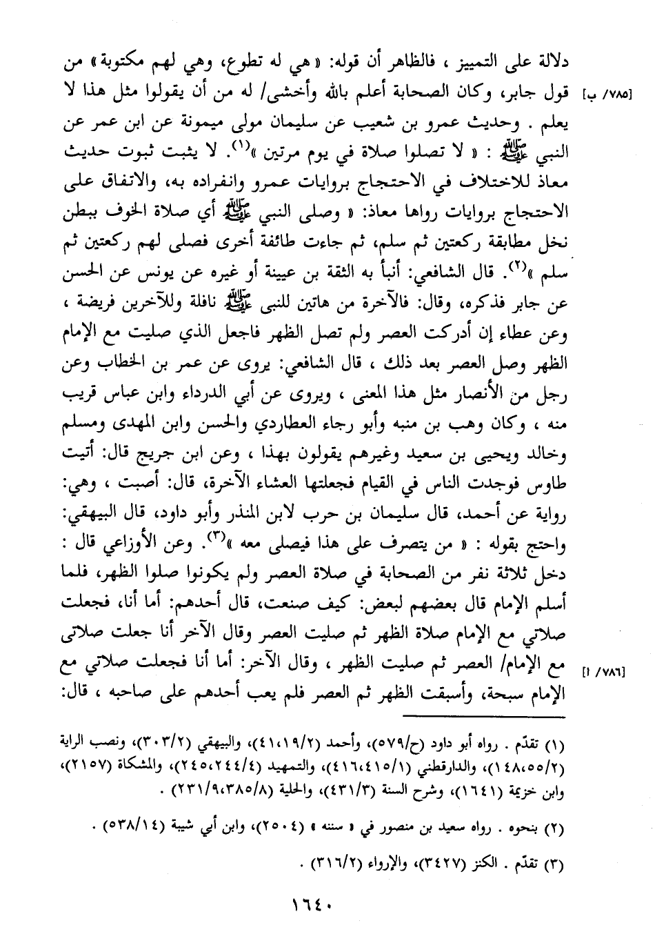 الاحتجاج بروايات رواها معاذ: " وصلى النبي صَلَّى اللَّهُ عَلَيْهِ وَسَلَّمَ أي صلاة الخوف ببطن
