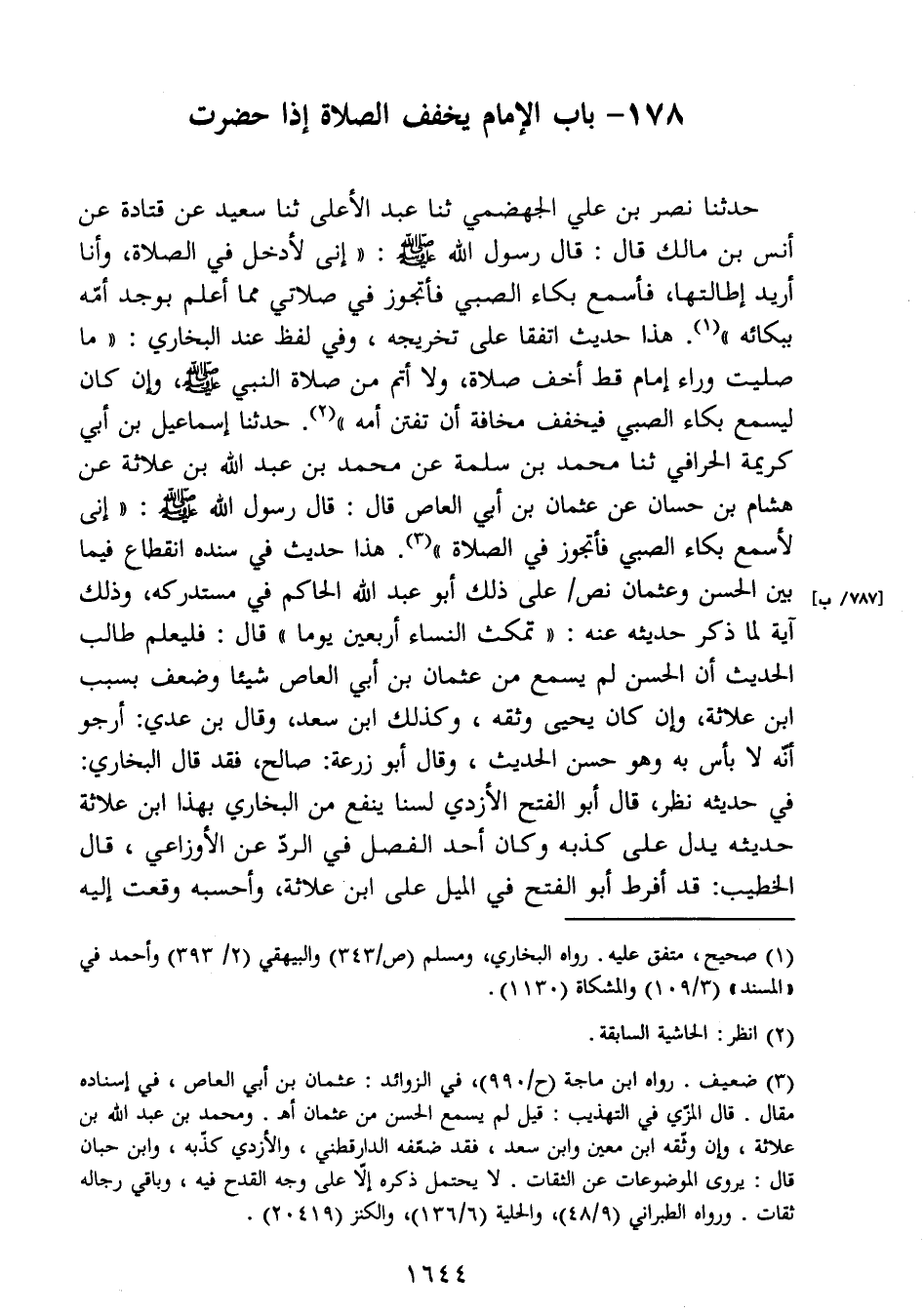 لأسمع بكاء الصبي فأتجوز في الصلاة " (3) . هذا حديث في سنده انقطاع فيما