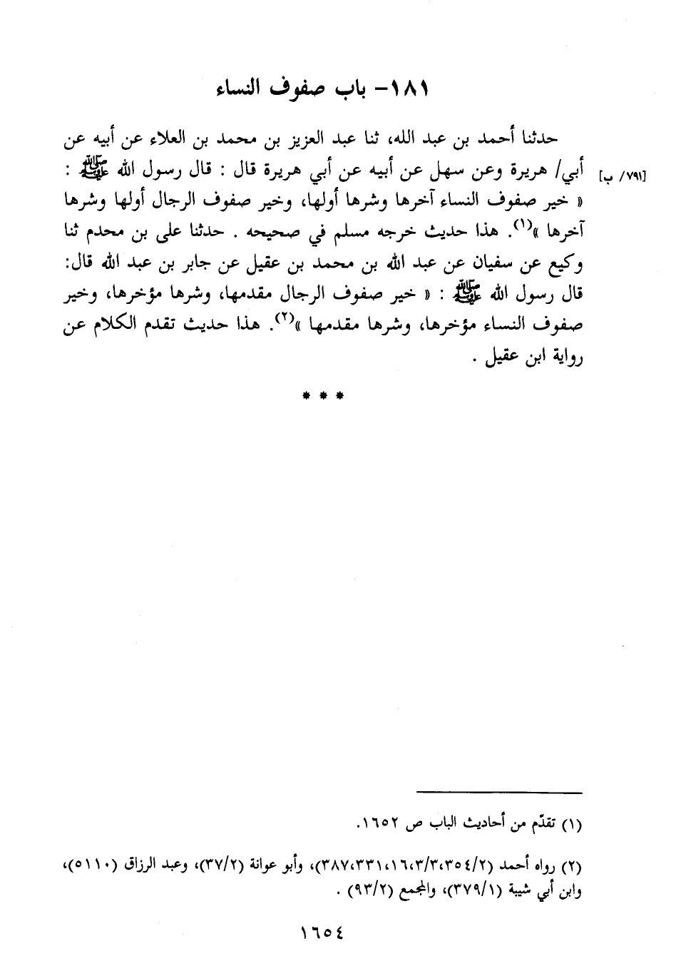 صفوف النساء مؤخرها، وشرها مقدمها " (2) . هذا حديث تقدم الكلام عن