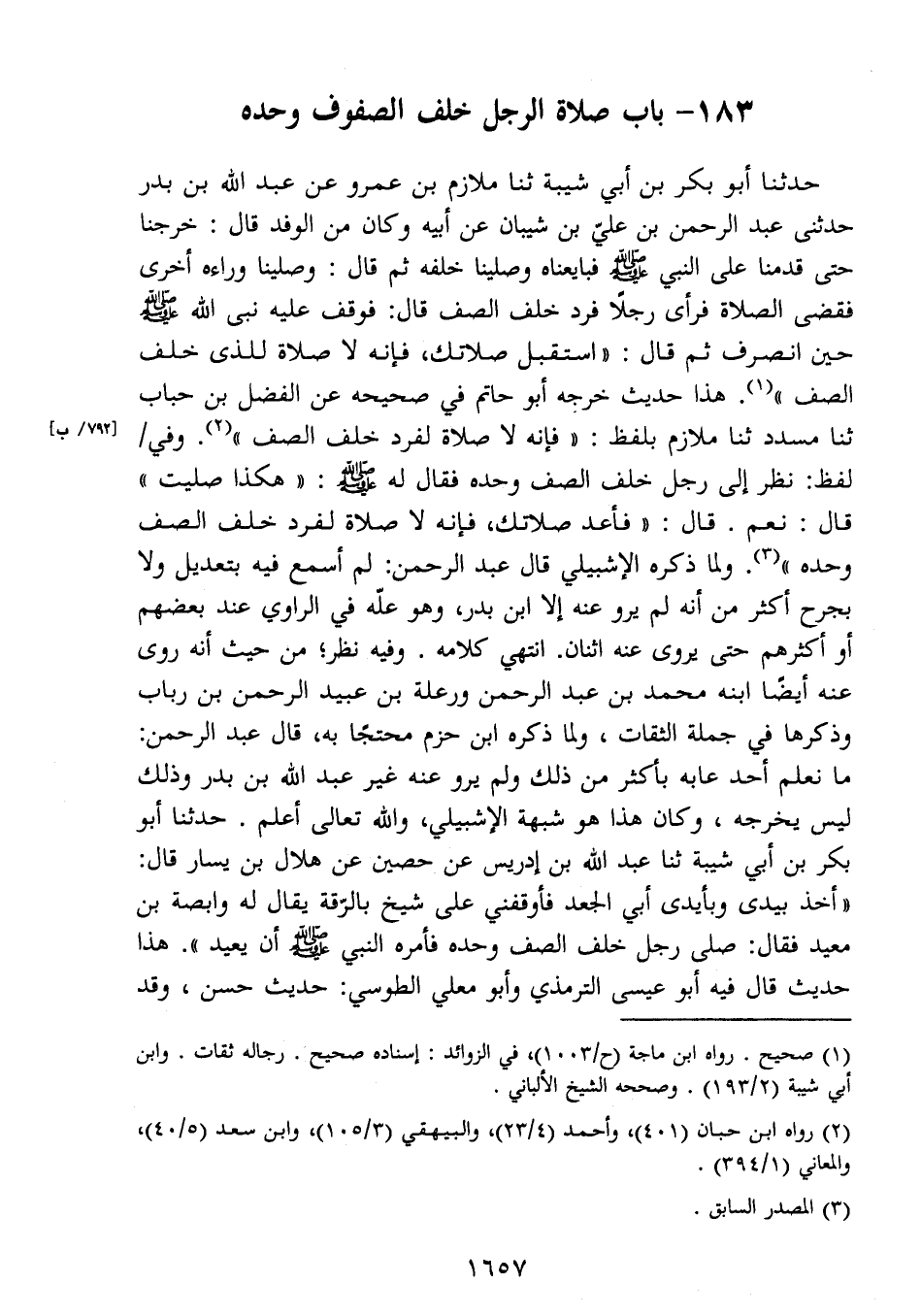 ثنا مسدد ثنا ملازم بلفظ: " فإنه لا صلاة لفرد خلف الصف " (2) . وفي/