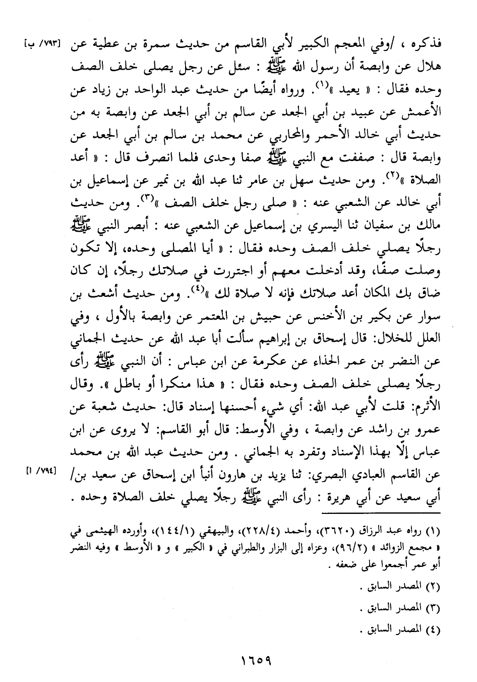 هلال عن وابصة أن رسول الله صَلَّى اللَّهُ عَلَيْهِ وَسَلَّمَ: سئل عن رجل يصلي خلف الصف