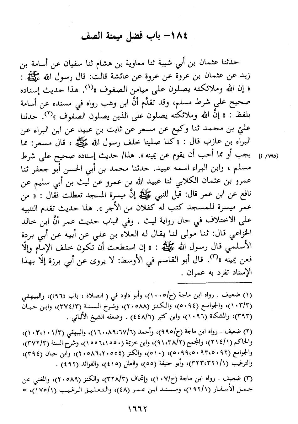 " إن الله وملائكته يصلون على ميامن الصفوف " (1) . هذا حديث إسناده