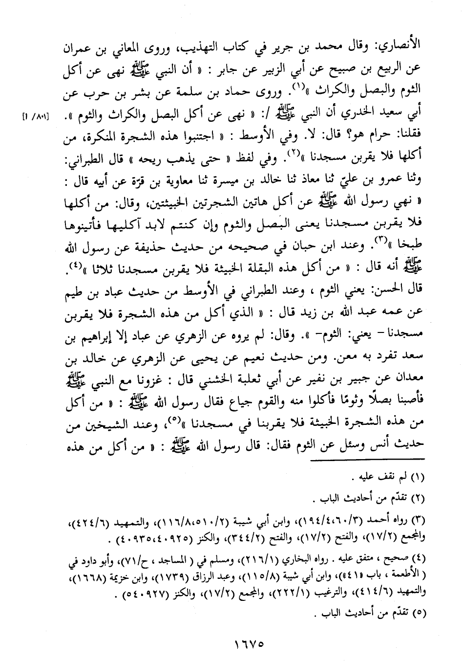 صَلَّى اللَّهُ عَلَيْهِ وَسَلَّمَ أنه قال: " من أكل هذه البقلة الخبيثة فلا يقربن مسجدنا ثلاثا " (4) .