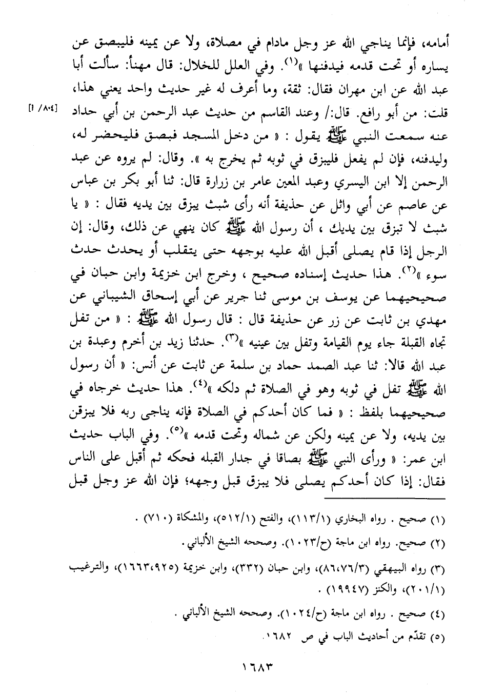 تجاه القبلة جاء يوم القيامة وتفل بين عينيه " (3) . حدثنا زيد بن أخرم وعبدة بن