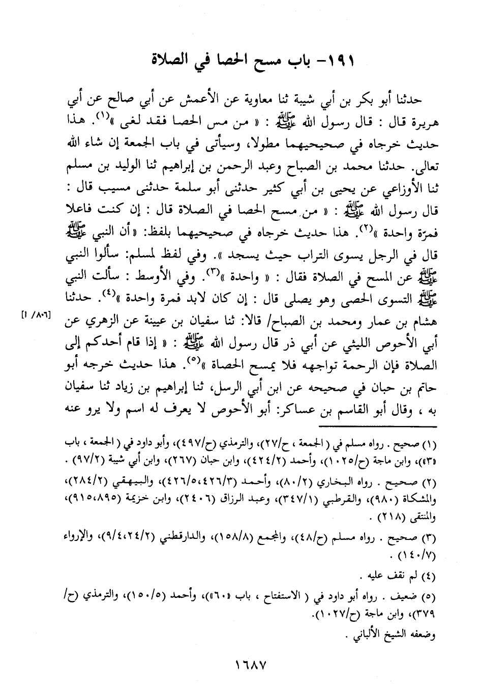صَلَّى اللَّهُ عَلَيْهِ وَسَلَّمَ التسوى الحصى وهو يصلى قال: إن كان لابد فمرة واحدة " (4) . حدثنا