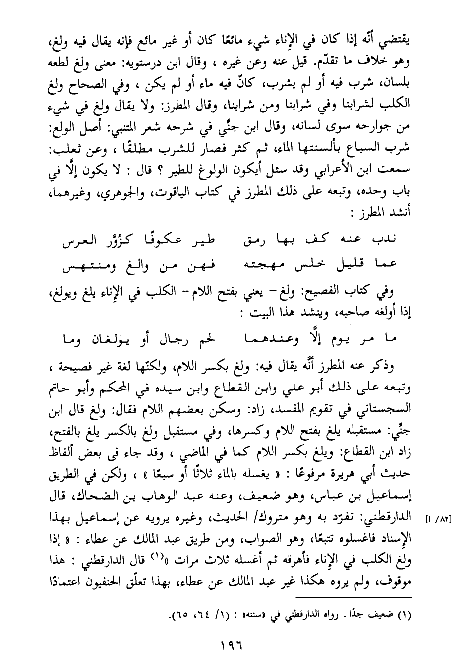وذكر عنه المطرز انه يقال فيه: ولغ بكسر اللام، ولكنّها لغة غير فصيحة،