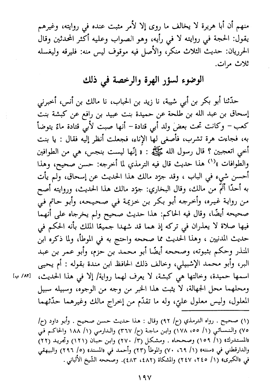 أخي أتعجبين؟ قال رسول الله صَلَّى اللَّهُ عَلَيْهِ وَسَلَّمَ: " إنها ليست بنجس، هي من الطوافين
