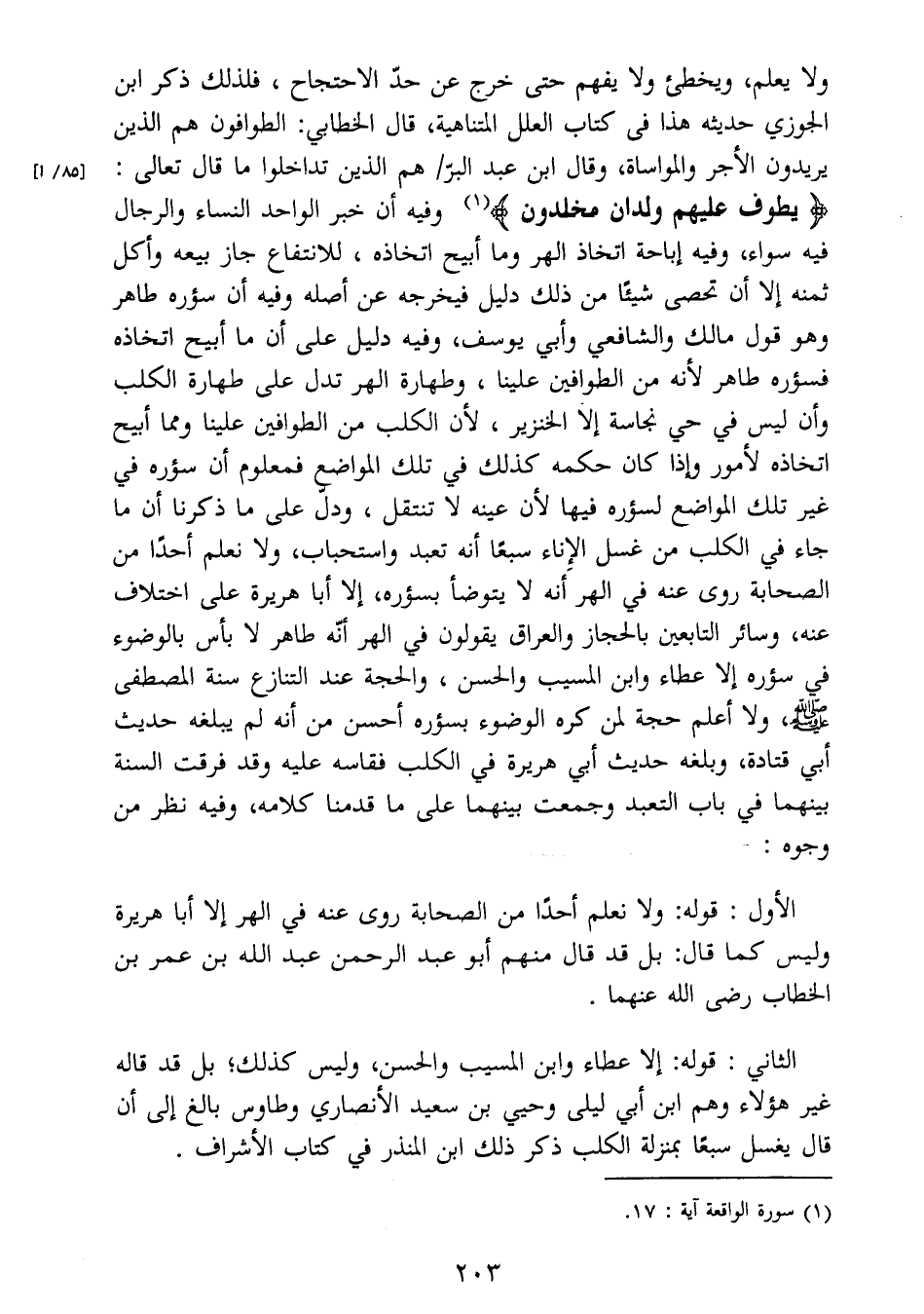 وأن ليس في حي نجاسة إلا الخنزير، لأن الكلب من الطوافين علينا ومما أبيح