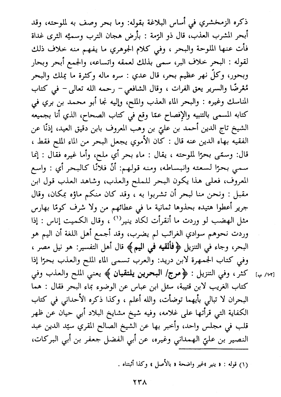 وفي كتاب الجمهرة لابن دريد: والعرب تسمى الماء الملح والعذب بحرًا إذا