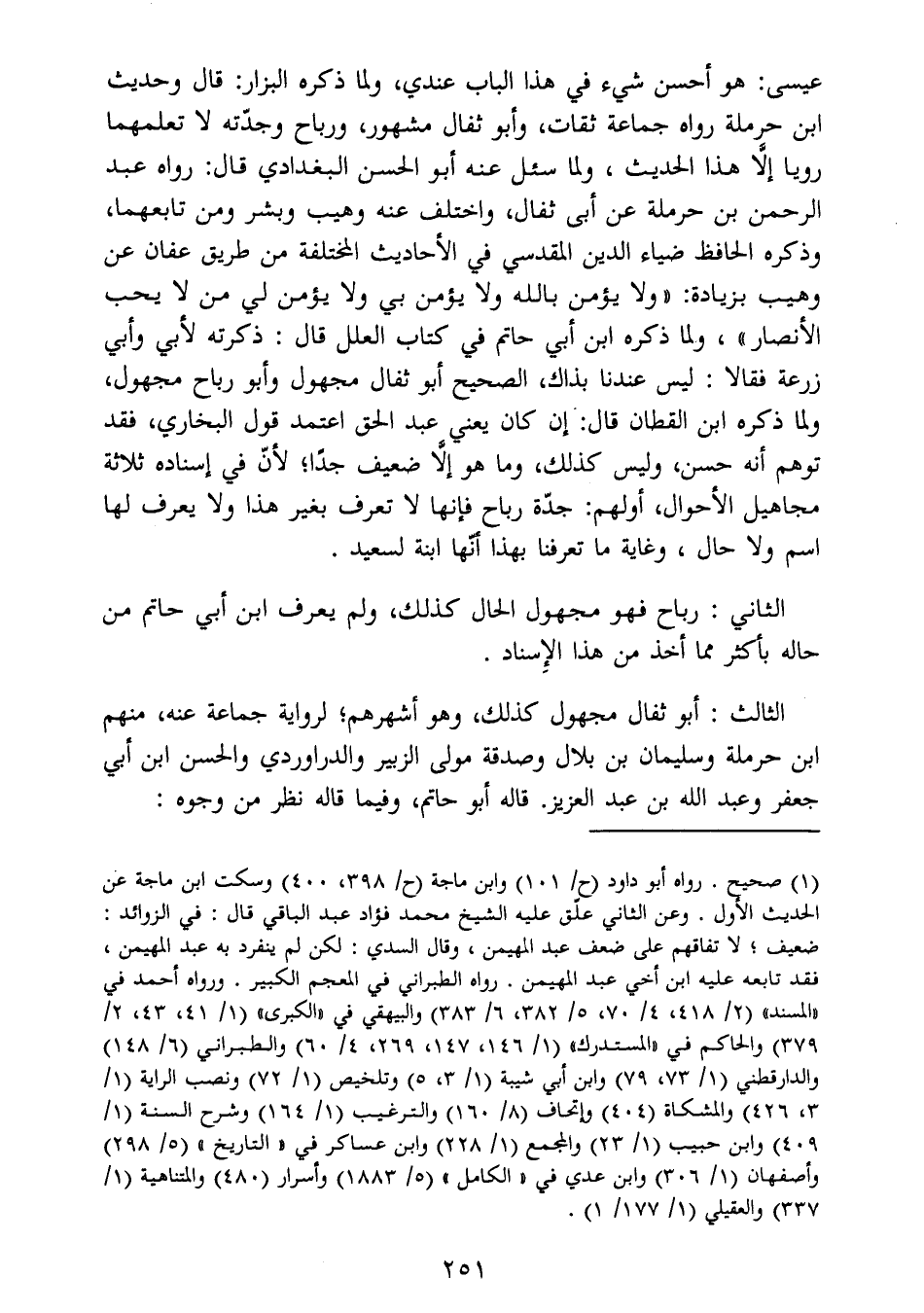 ابن حرملة رواه جماعة ثقات، وأبو ثفال مشهور، ورباح وجدّته لا تعلمهما
