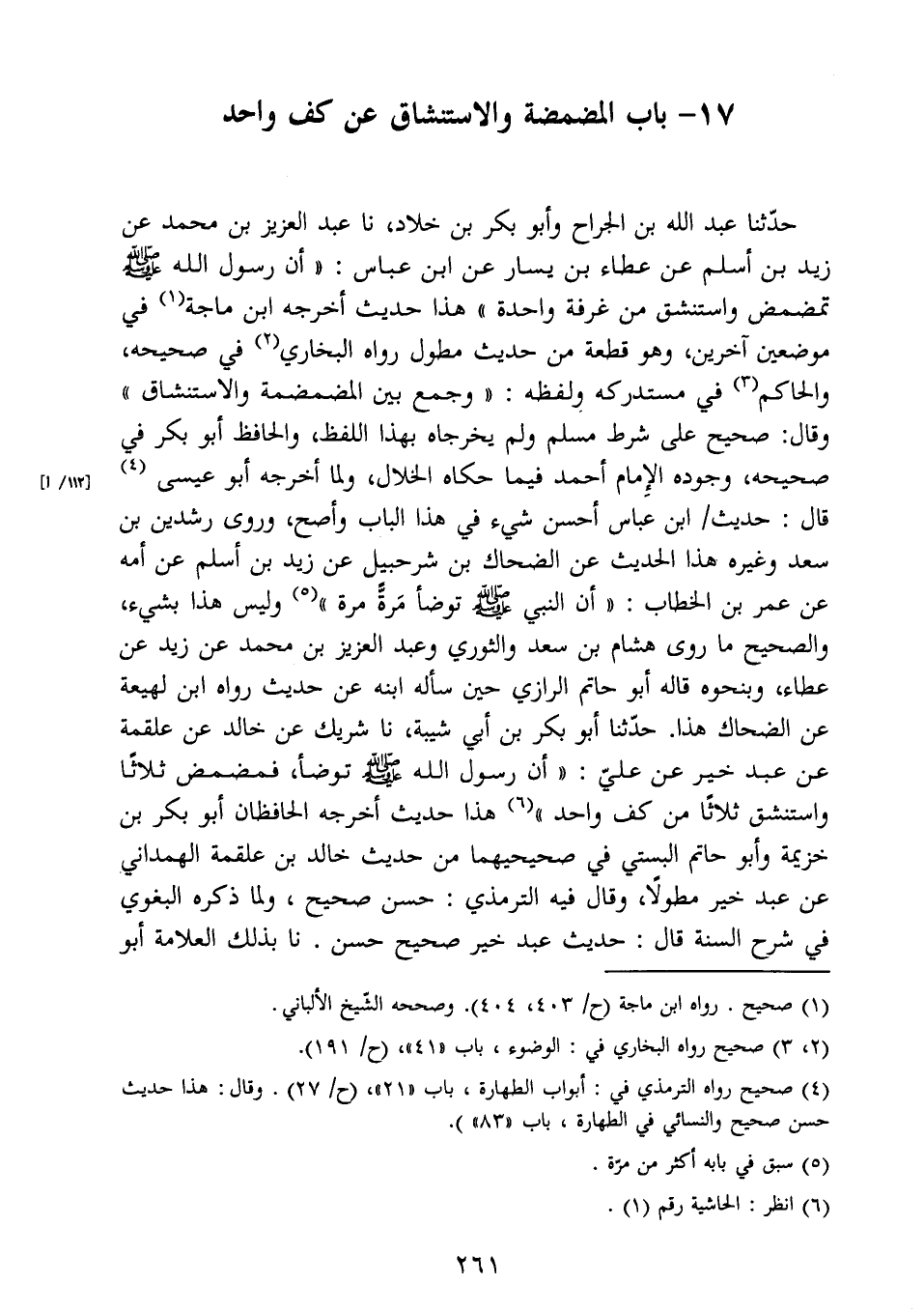 واستنشق ثلاثًا من كف واحد " (6) هذا حديث أخرجه الحافظان أبو بكر بن
