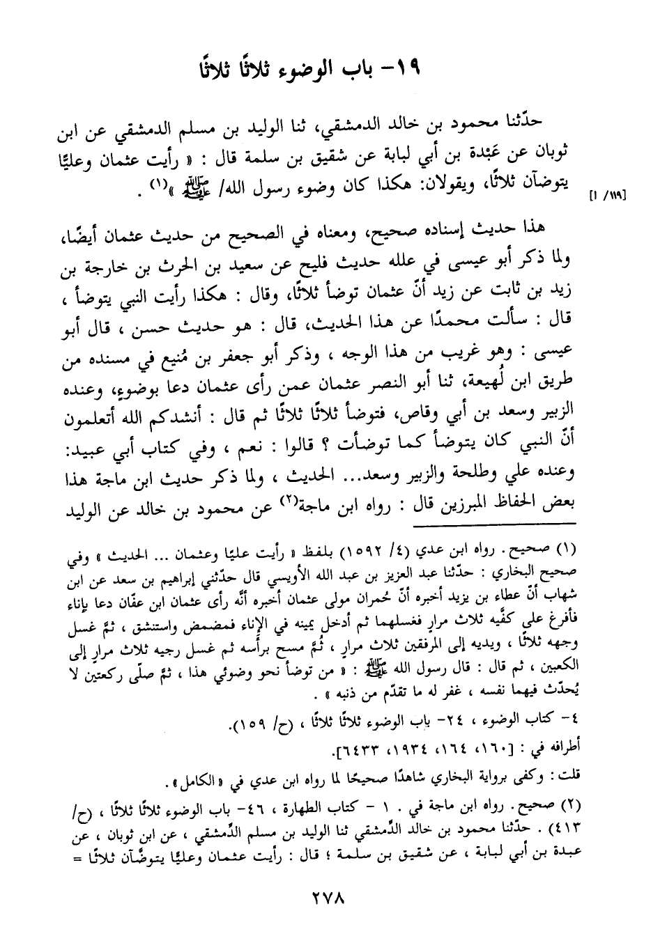 4- كتاب الوضوء، 24- باب الوضوء ثلاثا ثلاثا، (ح/159) .