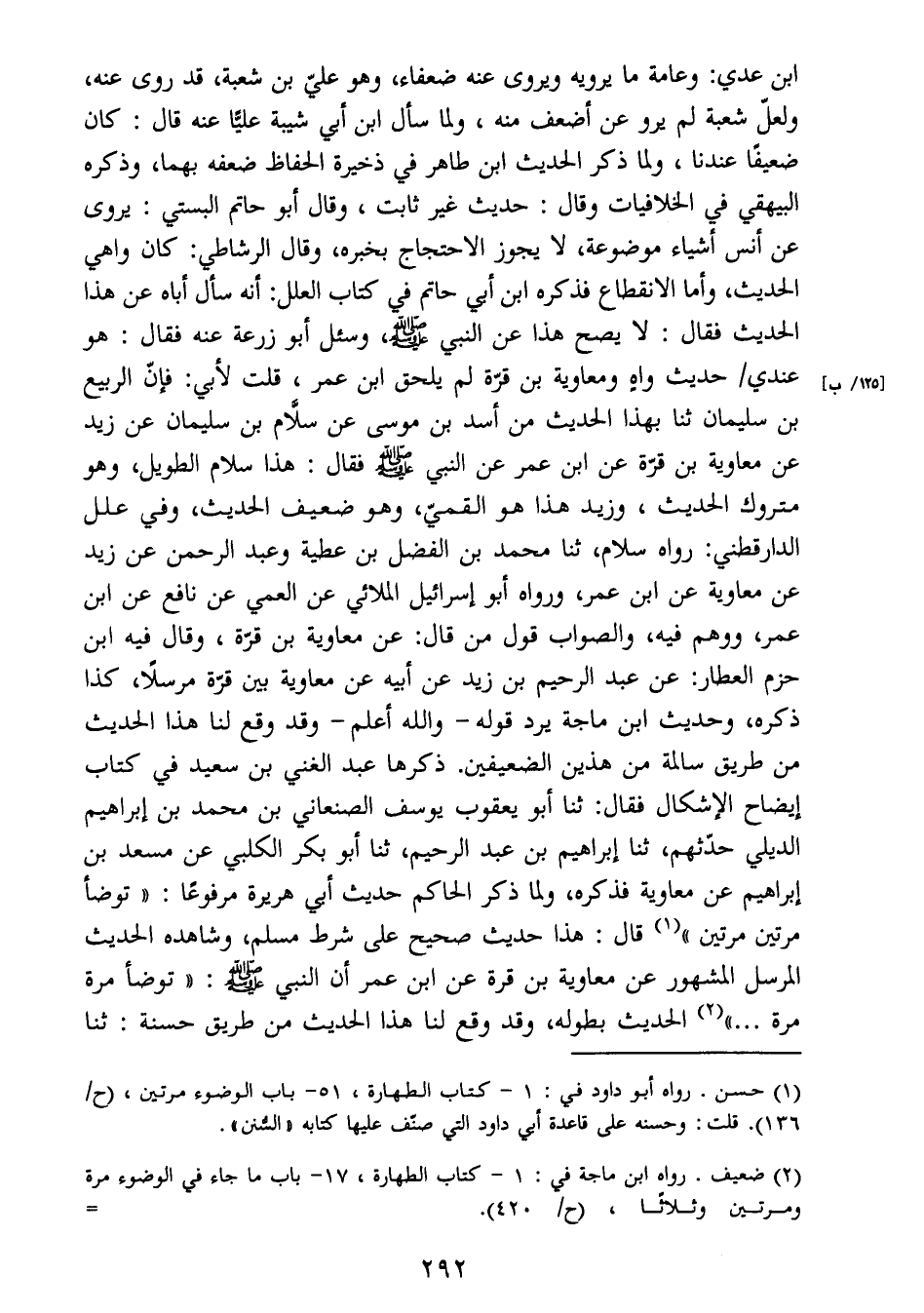 (2) ضعيف. رواه ابن ماجة في: 1- كتاب الطهارة، 17- باب ما جاء في الوضوء مرة