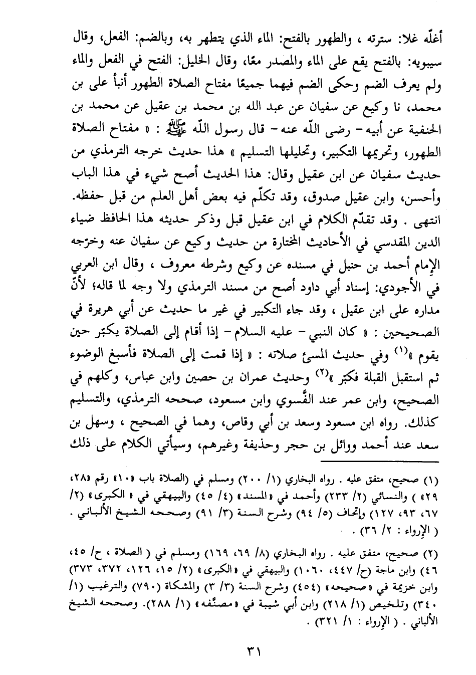 الحنفية عن أبيه- رضى الله عنه- قال رسول الله صَلَّى اللَّهُ عَلَيْهِ وَسَلَّمَ:"مفتاح الصلاة
