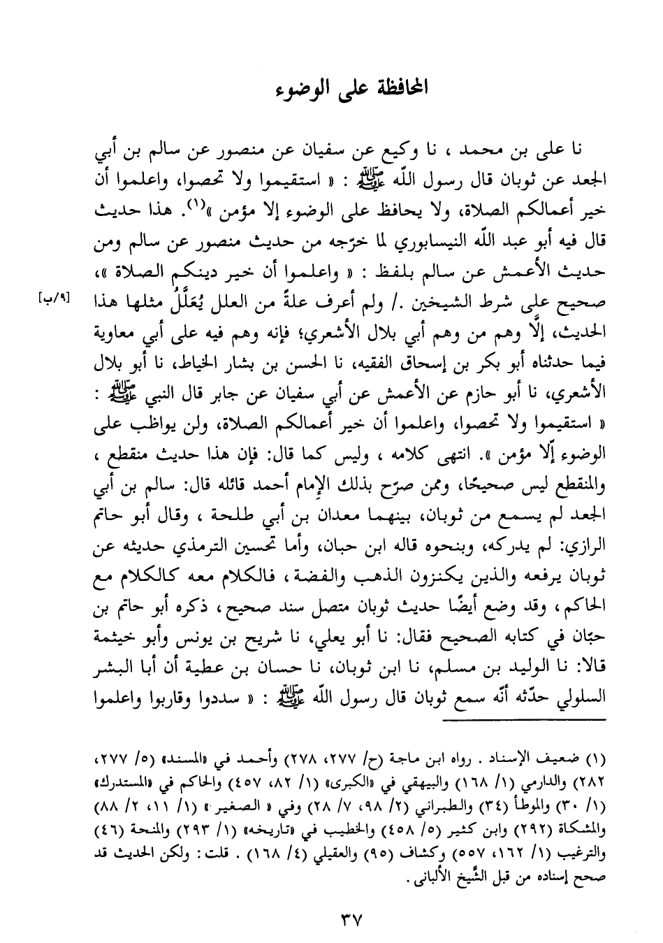 الوضوء إّلا مؤمن". انتهى كلامه، وليس كما قال: فإن هذا حديث منقطع،