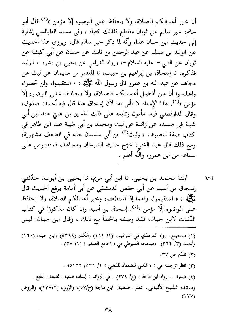 على الوضوء إلّا مؤمن " (4) . إسحاق بن أسيد وإن كان مذكورا في كتاب