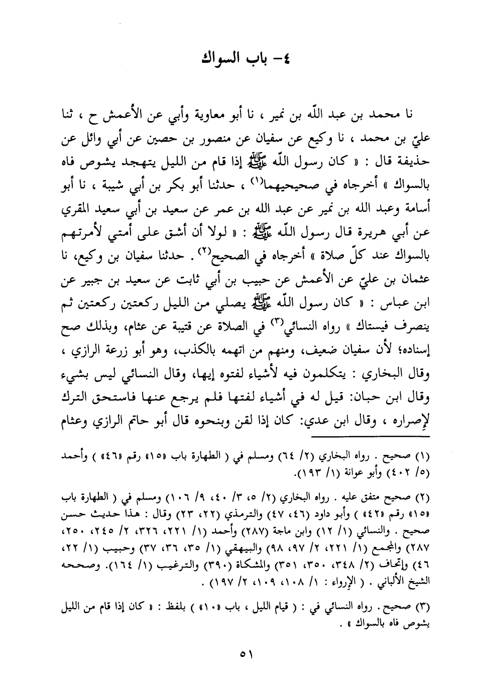 بالسواك"أخرجاه في صحيحيهما (1) ، حدثنا أبو بكر بن أبي شيبة، نا أبو
