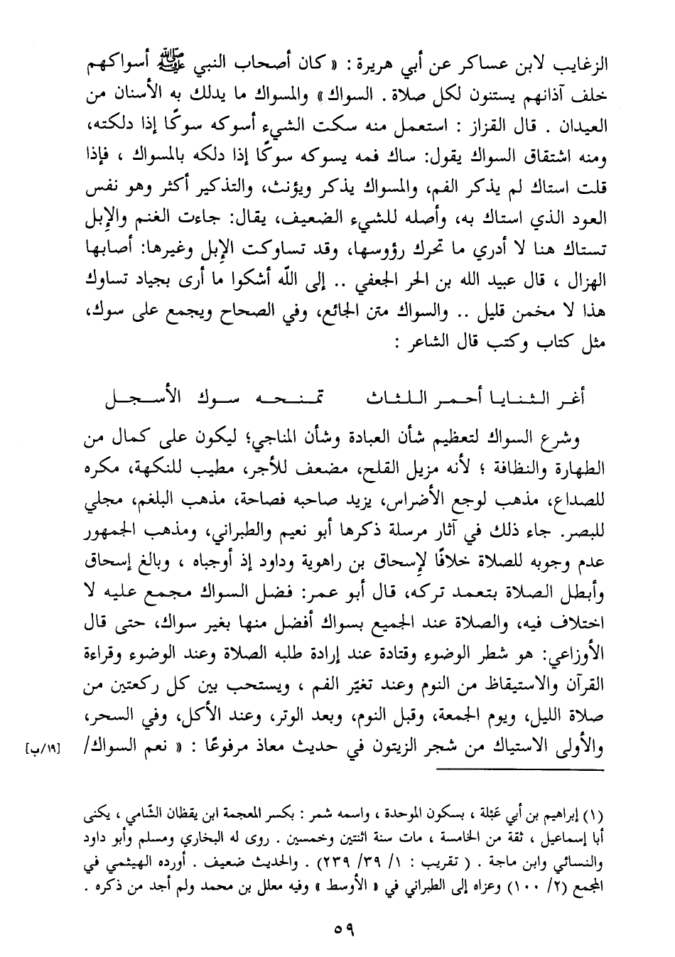 الزغايب لابن عساكر عن أبي هريرة:"كان أصحاب النبي صَلَّى اللَّهُ عَلَيْهِ وَسَلَّمَ أسواكهم