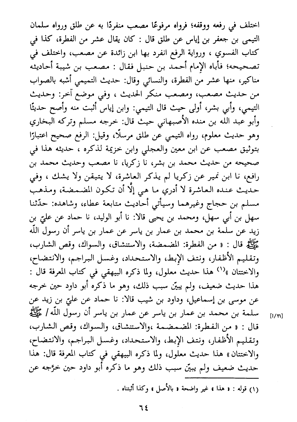 والاختتان"هذا حديث معلول، ولما ذكره البيهقي في كتاب المعرفة قال: هذا