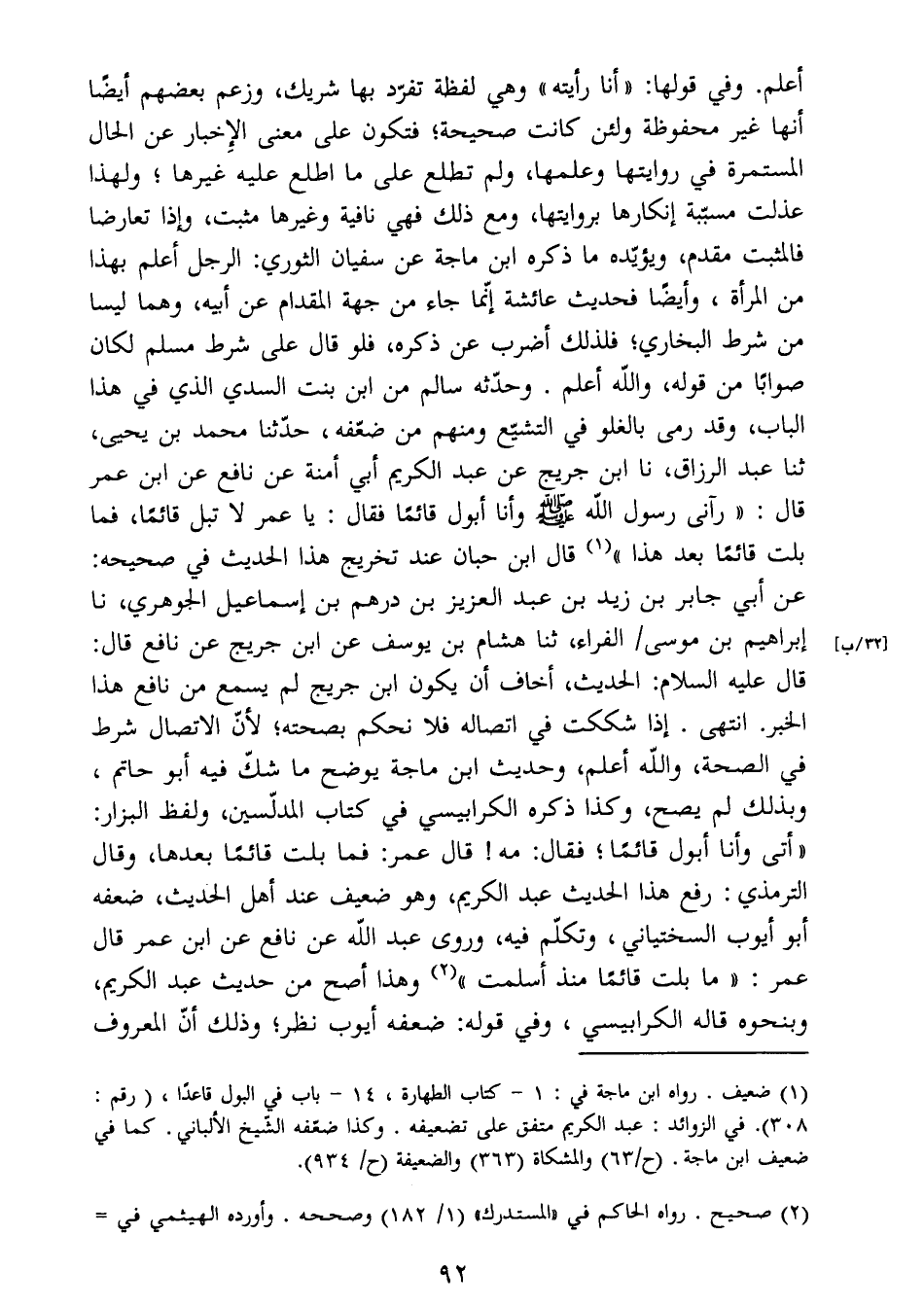 عمر:"ما بلت قائما منذ أسلمت " (2) وهذا أصح من حديث عبد الكريم،