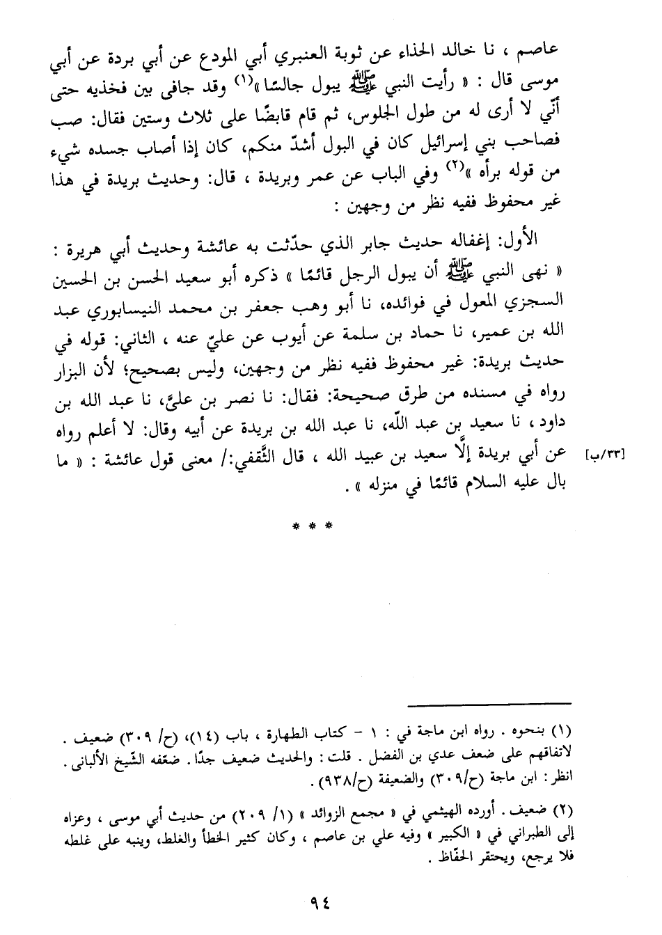 موسى قال:"رأيت النبي صَلَّى اللَّهُ عَلَيْهِ وَسَلَّمَ يبول جالسا" (1) وقد جافى بين فخذيه حتى