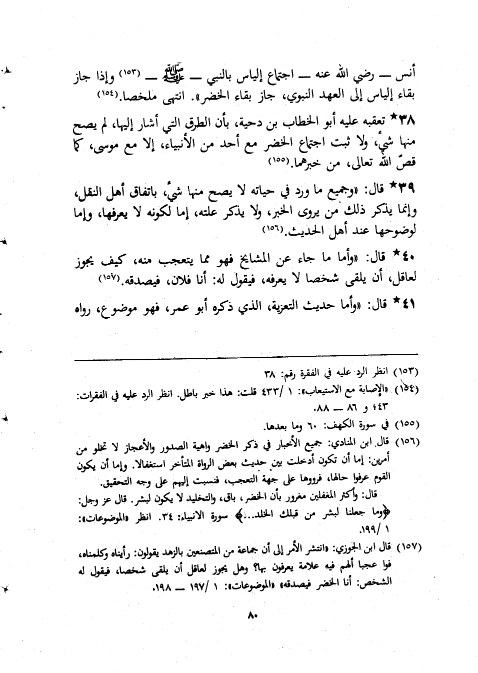 38 - تعقبه عَلَيْهِ أَبُو الْخطاب بن دحْيَة، بِأَن الطّرق الَّتِي اشار إِلَيْهَا، لم يَصح مِنْهَا شَيْء، وَلَا ثَبت اجْتِمَاع الْخضر مَعَ أحد من الْأَنْبِيَاء، إِلَّا مَعَ مُوسَى، كَمَا قصّ الله تَعَالَى، من خبرهما.