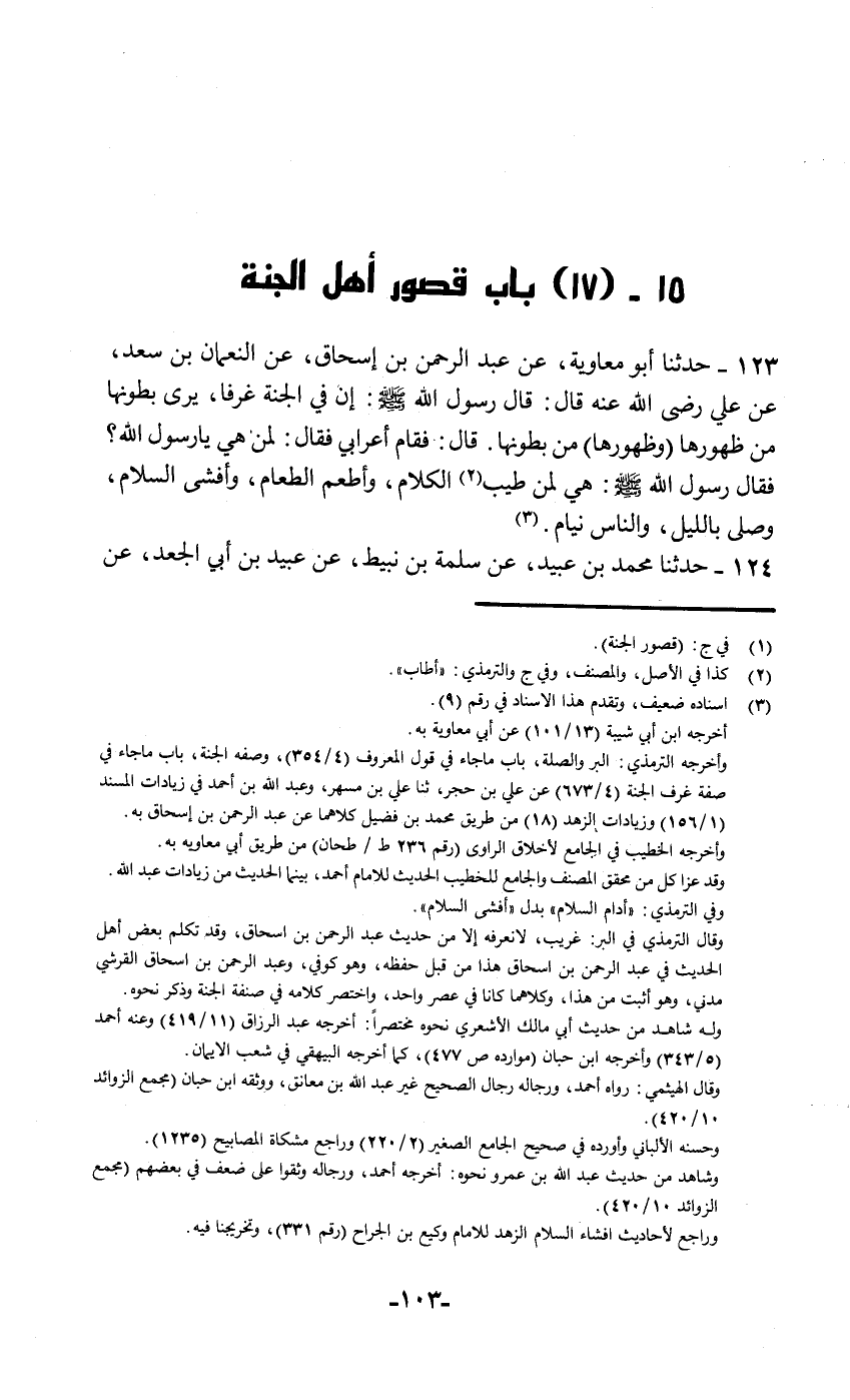 123 - حَدَّثَنَا أَبُو مُعَاوِيَةَ , عَنْ عَبْدِ الرَّحْمَنِ بْنِ إِسْحَاقَ , عَنِ النُّعْمَانِ بْنِ سَعْدٍ , عَنْ عَلِيٍّ رَضِيَ اللَّهُ عَنْهُ قَالَ: قَالَ رَسُولُ اللَّهِ صَلَّى اللهُ عَلَيْهِ وَسَلَّمَ: «إِنَّ §فِي الْجَنَّةِ غُرَفًا يُرَى بُطُونُهَا مِنْ ظُهُورِهَا، وَظُهُورُهَا مِنْ بُطُونِهَا» قَالَ: فَقَامَ أَعْرَابِيُّ , فَقَالَ: لِمَنْ هِيَ يَا رَسُولَ اللَّهِ؟ فَقَالَ رَسُولُ اللَّهِ صَلَّى اللهُ عَلَيْهِ وَسَلَّمَ: «هِيَ لِمَنْ طَيَّبَ الْكَلَامَ وَأَطْعَمَ الطَّعَامَ , وَأَفْشَى السَّلَامَ وَصَلَّى بِاللَّيْلِ وَالنَّاسُ نِيَامٌ»