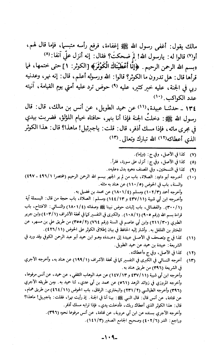 134 - حَدَّثَنَا عَبِيدَةُ , عَنْ حُمَيْدٍ الطَّوِيلِ , عَنْ أَنَسِ بْنِ مَالِكٍ قَالَ: قَالَ رَسُولُ اللَّهِ صَلَّى اللهُ عَلَيْهِ وَسَلَّمَ §دَخَلْتُ الْجَنَّةَ , فَإِذَا أَنَا بِنَهَرٍ حَافَّتَاهُ خِيَامُ اللُّؤْلُؤِ فَضَرَبْتُ بِيَدِي فِي مَجْرَى مَائِهِ فَإِذَا مِسْكٌ أَذْفَرُ قَالَ: قُلْتُ يَا جِبْرَئِيلُ مَا هَذَا؟ قَالَ: هَذَا الْكَوْثَرُ الَّذِي أَعْطَاكَهُ اللَّهُ تَبَارَكَ وَتَعَالَى "