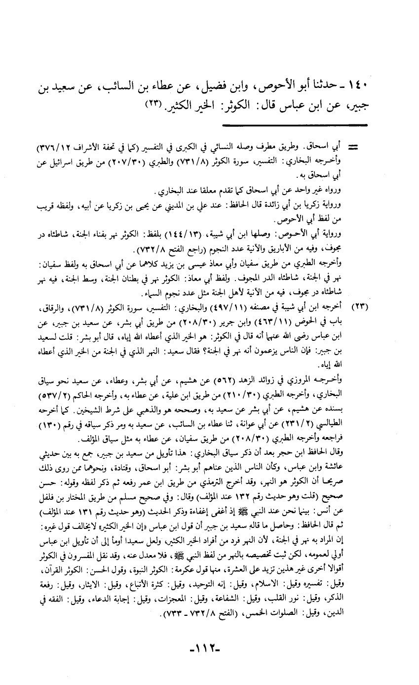 140 - حَدَّثَنَا أَبُو الْأَحْوَصِ , وَابْنُ فُضَيْلٍ عَنْ عَطَاءِ بْنِ السَّائِبِ , عَنْ سَعِيدِ بْنِ جُبَيْرٍ , عَنِ ابْنِ عَبَّاسٍ قَالَ: «§الْكَوْثَرُ الْخَيْرُ الْكَثِيرُ»