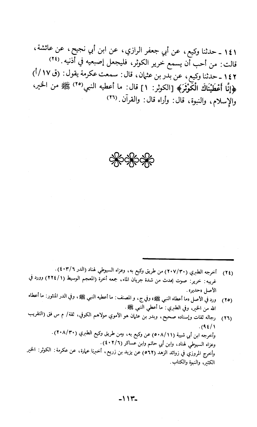 142 - حَدَّثَنَا وَكِيعٌ , عَنْ بَدْرِ بْنِ عُثْمَانَ قَالَ: سَمِعْتُ عِكْرِمَةَ يَقُولُ: {§إِنَّا أَعْطَيْنَاكَ الْكَوْثَرُ} [الكوثر: 1] قَالَ: " مَا أُعْطِيَهُ النَّبِيَّ صَلَّى اللهُ عَلَيْهِ وَسَلَّمَ مِنَ الْخَيْرِ وَالْإِسْلَامِ وَالنُّبُوَّةِ , قَالَ: وَأُرَاهُ قَالَ: وَالْقُرْآنِ