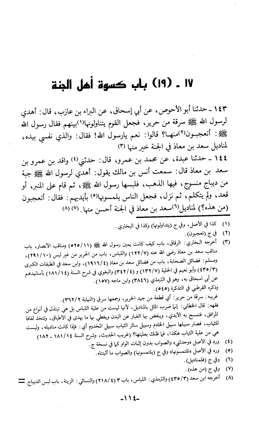 143 - حَدَّثَنَا أَبُو الْأَحْوَصِ , عَنْ أَبِي إِسْحَاقَ , عَنِ الْبَرَاءِ بْنِ عَازِبٍ قَالَ: أُهْدِيَ لِرَسُولِ اللَّهِ صَلَّى اللهُ عَلَيْهِ وَسَلَّمَ سَرَقَةٌ مِنْ حَرِيرٍ فَجَعَلَ الْقَوْمُ يَتَنَاوَلُونَهَا بَيْنَهُمْ , فَقَالَ رَسُولُ اللَّهِ صَلَّى اللهُ عَلَيْهِ وَسَلَّمَ: «أَتَعْجَبُونَ مِنْهَا» ؟ قَالُوا: نَعَمْ يَا رَسُولَ اللَّهِ , فَقَالَ: «وَالَّذِي نَفْسِي بِيَدِهِ §لَمَنَادِيلُ سَعْدِ بْنِ مُعَاذٍ فِي الْجَنَّةِ خَيْرٌ مِنْهَا»