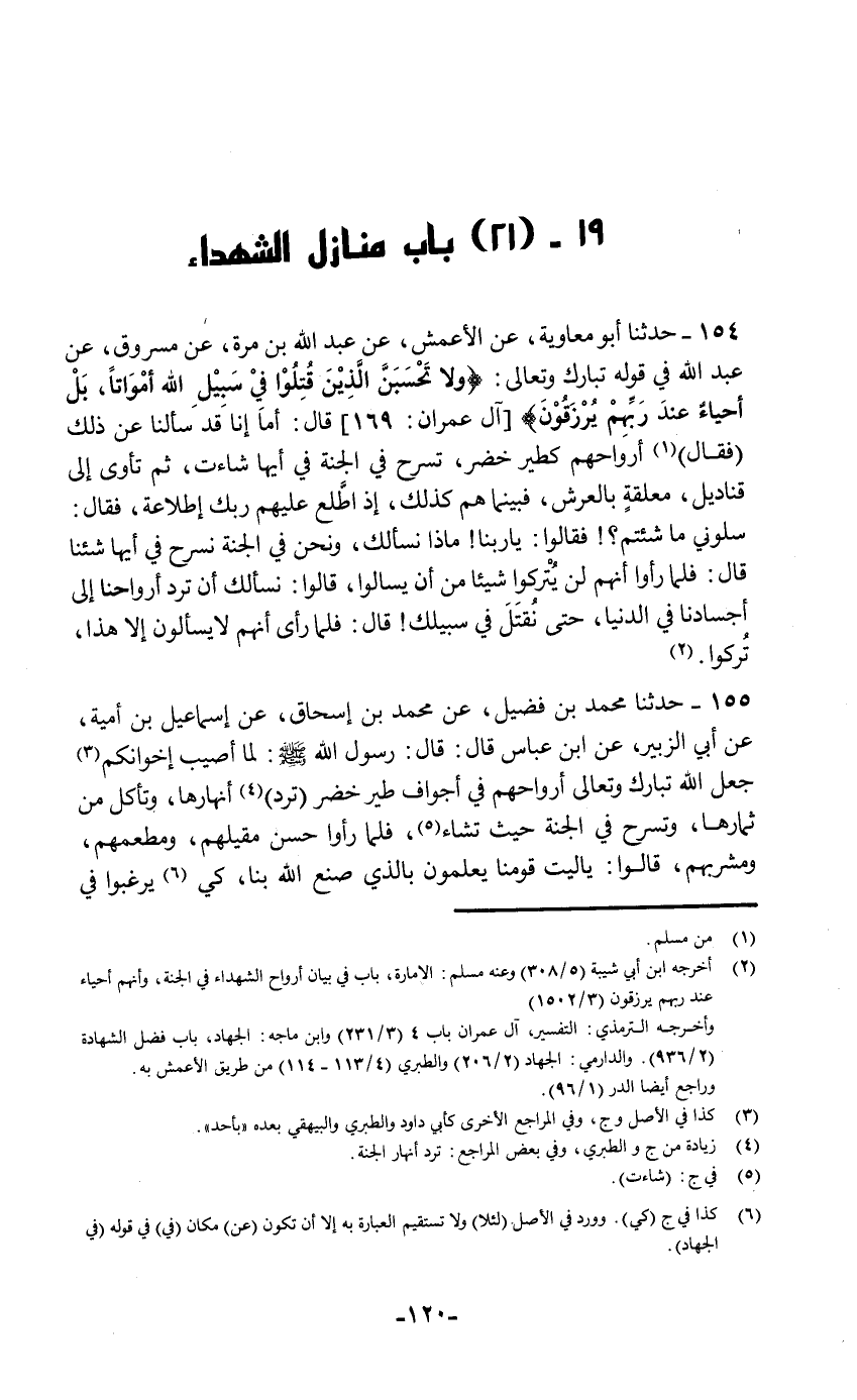 154 - حَدَّثَنَا أَبُو مُعَاوِيَةَ , عَنِ الْأَعْمَشِ , عَنْ عَبْدِ اللَّهِ بْنِ مُرَّةَ , عَنْ مَسْرُوقٍ , عَنْ عَبْدِ اللَّهِ فِي قَوْلِهِ تَبَارَكَ وَتَعَالَى: {§وَلَا تَحْسَبَنَّ الَّذِينَ قُتِلُوا فِي سَبِيلِ اللَّهِ أَمْوَاتًا بَلْ أَحْيَاءٌ عِنْدَ رَبِّهِمْ يُرْزَقُونَ} [آل عمران: 169] . قَالَ: أَمَا إِنَّا قَدْ سَأَلْنَا عَنْ ذَلِكَ , فَقَالَ: " أَرْوَاحُهُمْ كَطَيْرٍ خُضْرٍ تَسْرَحُ فِي الْجَنَّةِ فِي أَيِّهَا شَاءَتْ ثُمَّ تَأْوِي إِلَى قَنَادِيلَ مُعَلَّقَةٍ بِالْعَرْشِ , فَبَيْنَمَا هُمْ كَذَلِكَ إِذِ اطَّلَعَ عَلَيْهِمْ رَبُّكَ اطِّلَاعَةً فَقَالَ: سَلُونِي مَا شِئْتُمْ , فَقَالُوا: يَا رَبَّنَا , مَاذَا نَسْأَلُكَ وَنَحْنُ فِي الْجَنَّةِ نَسْرَحُ فِي أَيِّهَا شِئْنَا؟ قَالَ: فَلَمَّا رَأَوْا أَنَّهُمْ لَنْ يُتْرَكُوا شَيْئًا مِنْ أَنْ يَسْأَلُوا؛ قَالُوا: نَسْأَلُكَ أَنْ تَرُدَّ أَرْوَاحَنَا إِلَى أَجْسَادِنَا فِي الدُّنْيَا حَتَّى نُقْتَلَ فِي سَبِيلِكَ. قَالَ: فَلَمَّا رَأَى أَنَّهُمْ لَا يَسْأَلُونَ إِلَّا هَذَا تُرِكُوا